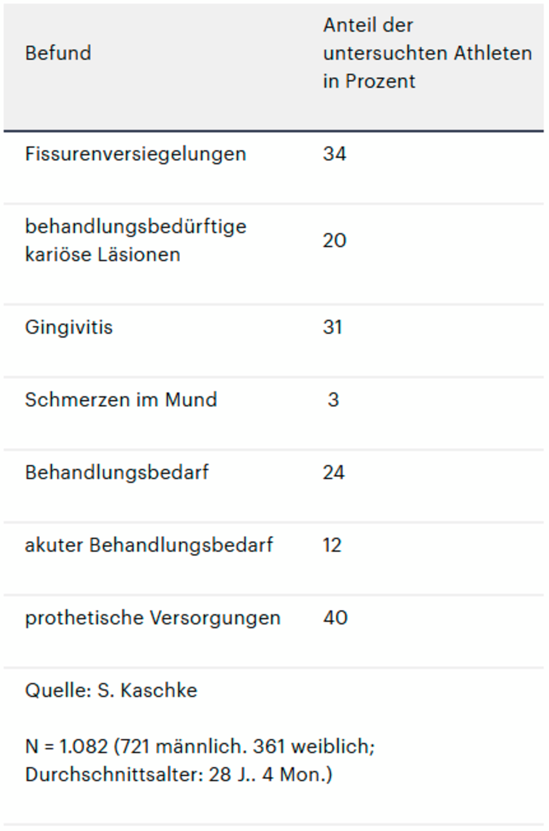 Die aktuellen Untersuchungsergebnisse weisen auf die Notwendigkeit einer besseren Prävention bei Menschen mit geistiger Behinderung hin: Der durchschnittliche DMF-T-Wert der untersuchten Athleten beträgt 5,6. Ihnen fehlen rund 1,3 Zähne (M-T), 3,8 Zähne sind mit einer Füllung versorgt. Die Sportler haben im Durchschnitt 0,5 zerstörte Zähne (D-T). Der Plaqueindex liegt bei 1,0.