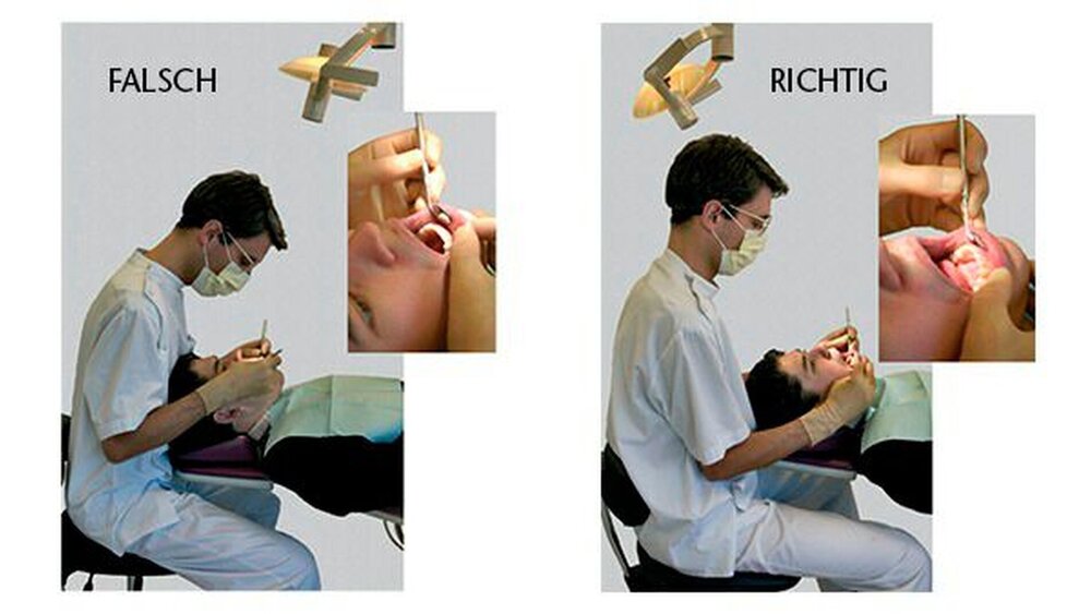Oft ist zu beobachten, dass die OP-Leuchte oberhalb der Brust des Patienten positioniert wird – mit der Folge, dass die Mundöffnung nach der Leuchte ausgerichtet wird, wodurch der Behandler seine „ideale“, nämlich symmetrische Arbeitshaltung verlassen muss und sich vornüberbeugt, so dass er in einer gesundheitlich ungünstigen Arbeitshaltung arbeitet (Abbildungen unten). Darüber hinaus werden durch die Hände des Behandlers Schatten im Arbeitsfeld und im Mund geworfen, durch die ungünstige Kontraste entstehen, so dass die Augen ermüden.