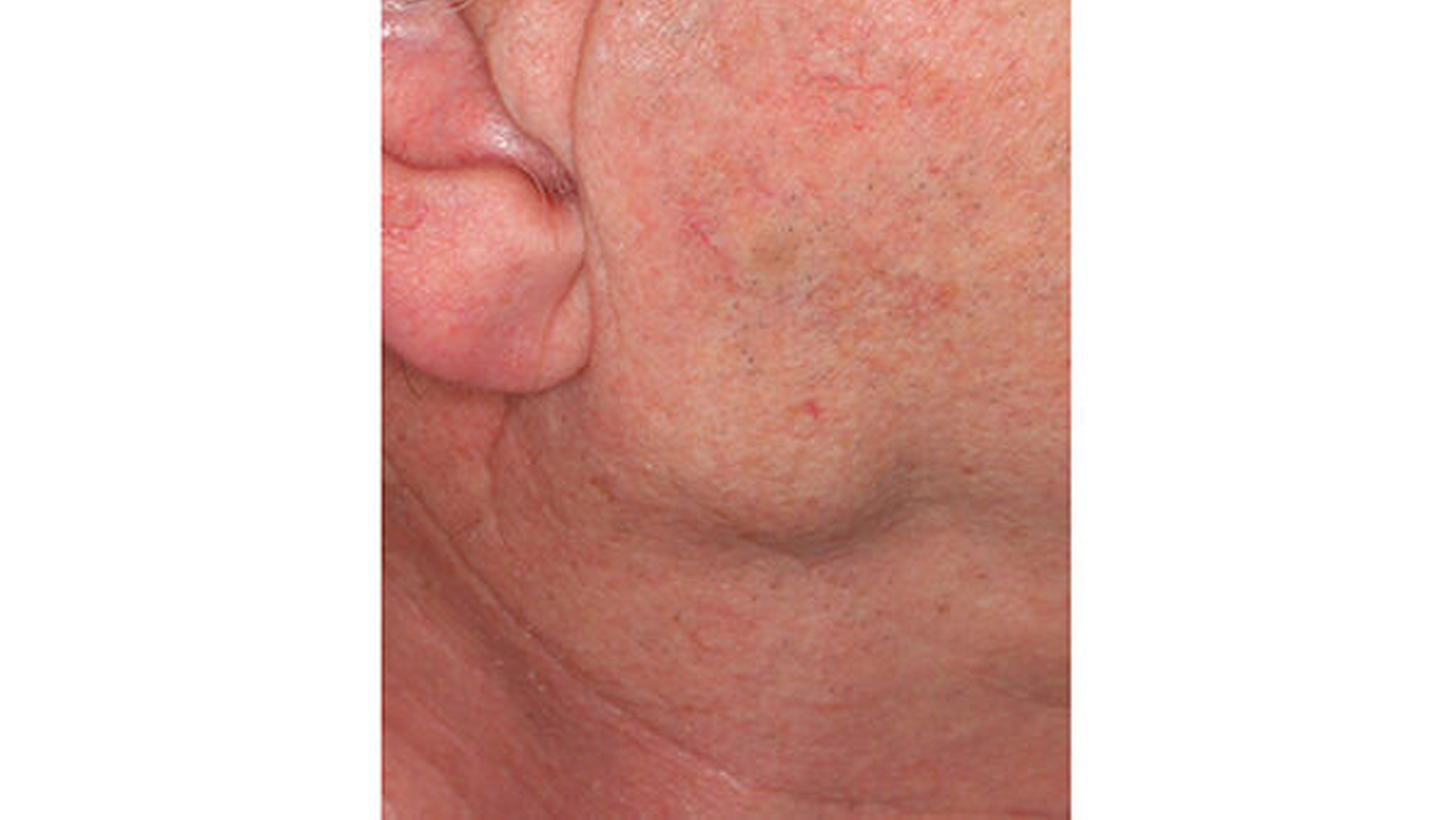 In den ersten postoperativen Tagen bestand ein Defizit des unteren Fazialisastes, das sich in den nächsten Tagen unter Beübung zeitgerecht besserte und schließlich normalisierte. Eine Störung der Sensibilität bestand nicht. Nach Abschluss der Wundheilung wurde im interdisziplinären Tumorboard die Entscheidung zu einer Radiatio getroffen. Anschließend stellte sich der Patient in engen, regelmäßigen Zeitabständen in der Poliklinik vor.