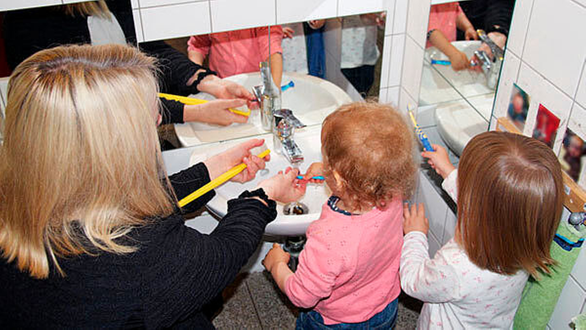 Mundgesundheit als Teil der Kindergesundheit ist Fürsorgepflicht der Eltern aber auch Bildungsauftrag in den Kindertageseinrichtungen. Und einige Familien geben diese Verantwortung morgens an der Kita ab. Wenn beide Eltern stark eingespannt sind sind, fehlen abends oft Kraft und Geduld, um den Kindern das Zähneputzen beizubringen. Gerade morgens kurz vor dem Aufbruch und abends vor dem Zubettgehen regieren Zeitdruck und Überforderung. Das Zähneputzen kann dann leicht zur lästigen Pflicht werden.