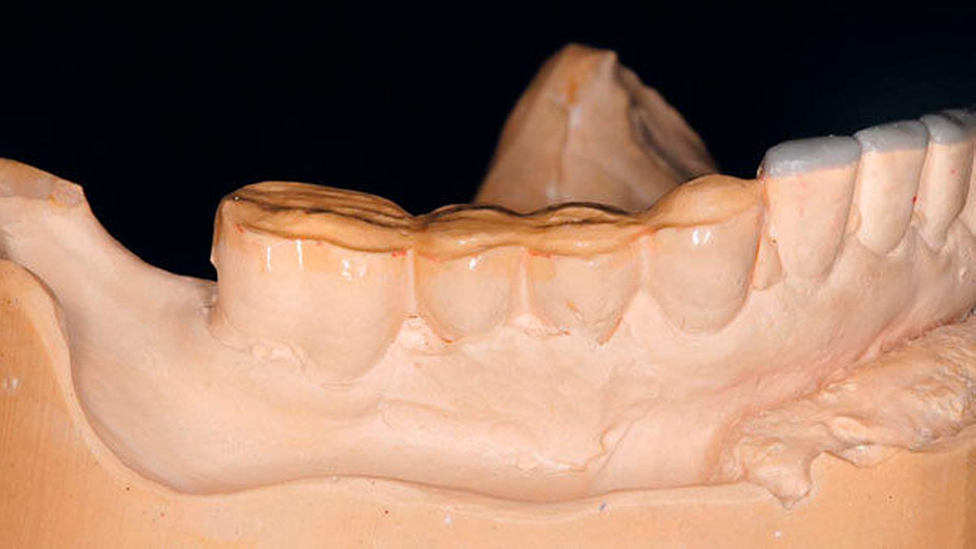 Beim Präparieren wurde eine ausgeprägte Stufe gelegt, und die Okklusalflächen wurden geringfügig reduziert (Abbildung 3). Das viergliedrige Table Top für die VMK- Brücke wurde aus Lithiumdisilikat-Glaskeramik gepresst und adhäsiv auf die Keramikoberfläche der vorhandenen Brücke eingegliedert. Anschließend erfolgte die adhäsive Befestigung des Table Tops 33 und der direkte Kompositaufbau der Unterkieferfront mittels Silikonschlüssel vom Wax-up. Drei Monate nach Eingliederung zeigte sich klinisch ein ästhetisch und funktionell einwandfreies Ergebnis (Abbildung 4).