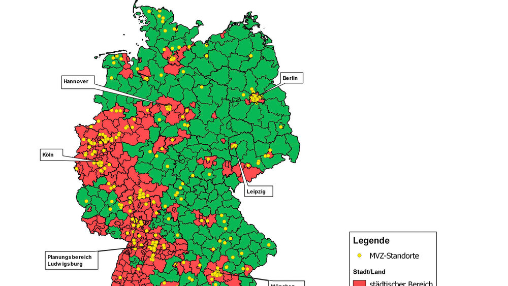 Zum 31. März 2017 gab es 232 rein zahnärztliche MVZ in städtischen Gebieten, sie bildeten einen Anteil von 76,6 Prozent. 23,4 Prozent (71 MVZ) lagen in ländlichen Gebieten.