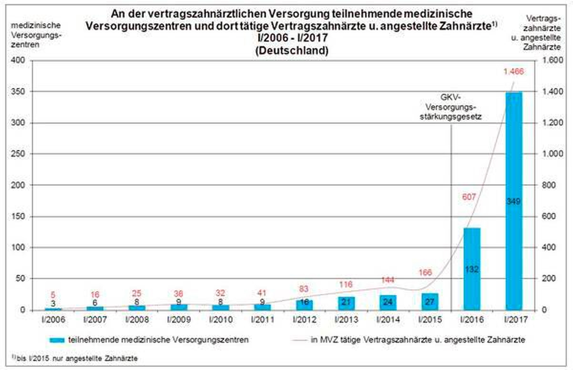Zum 31. März 2017 gab es 303 rein zahnärztliche MVZ, in denen 254 Vertragszahnärzte und 911 angestellte Zahnärzte tätig waren.