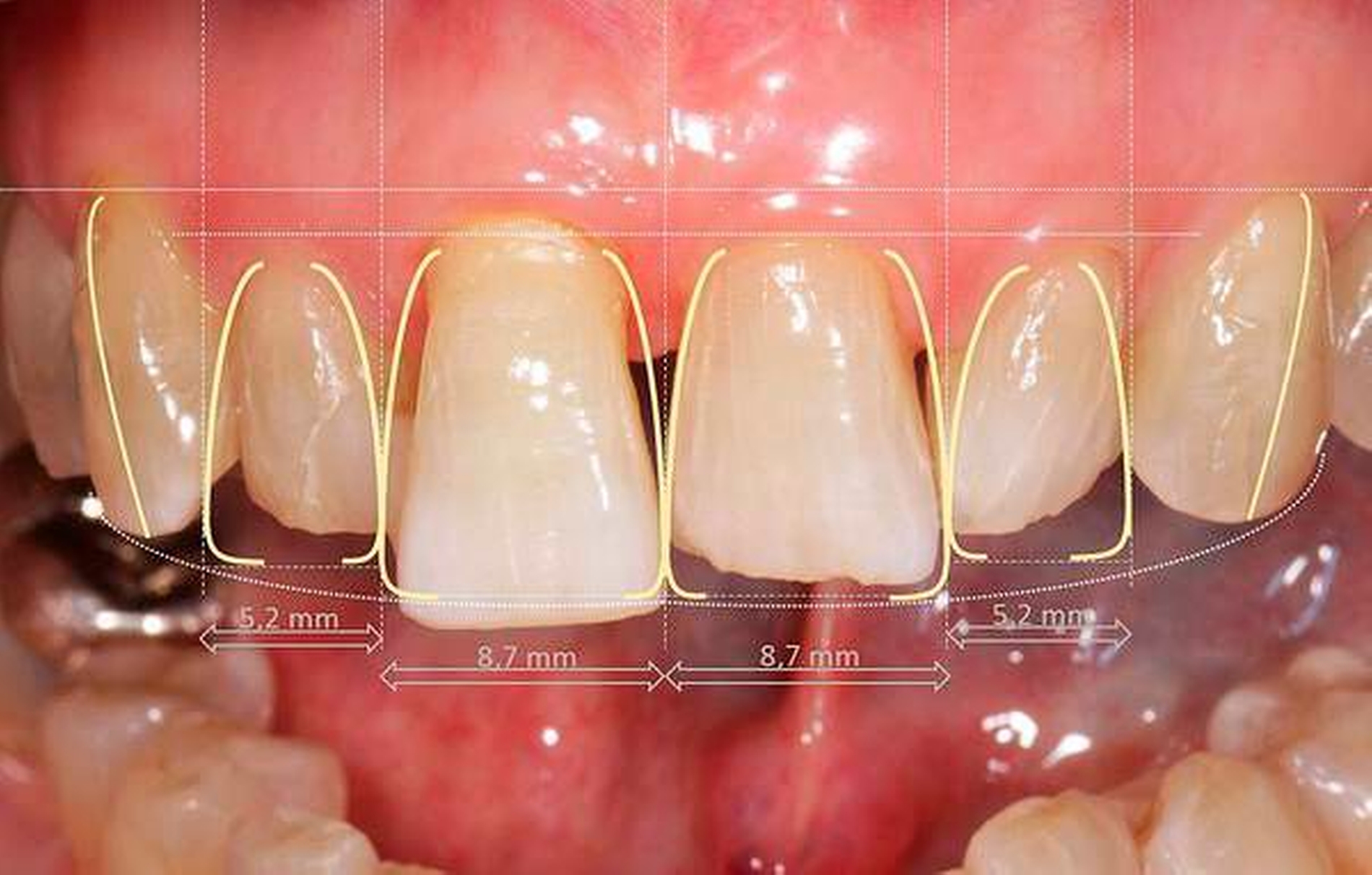 Anhand von Situationsmodellen wurden die Ist-Situation vermessen (Abbildung 1) und das Zielergebnis anhand der bekannten Grundregeln der Frontzahnästhetik in Form eines Wax-ups definiert (Abbildung 4). Ein gleichmäßiger Zahnbogen sollte durch additive Maßnahmen an 12, 21 und 22 und durch subtraktive Maßnahmen an 11 erfolgen.