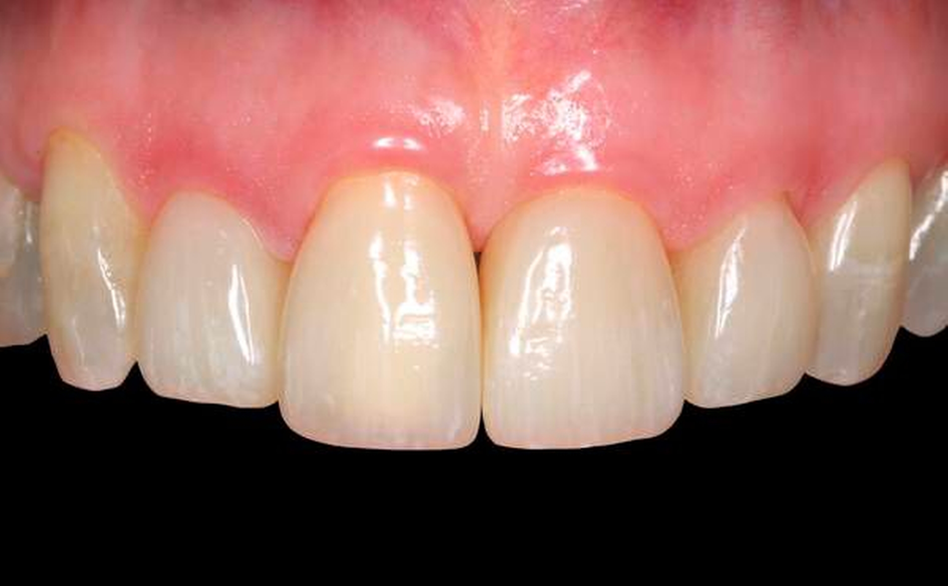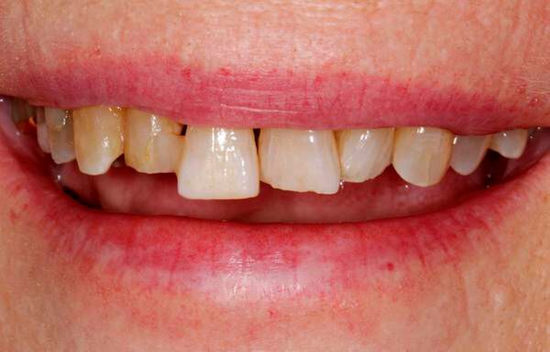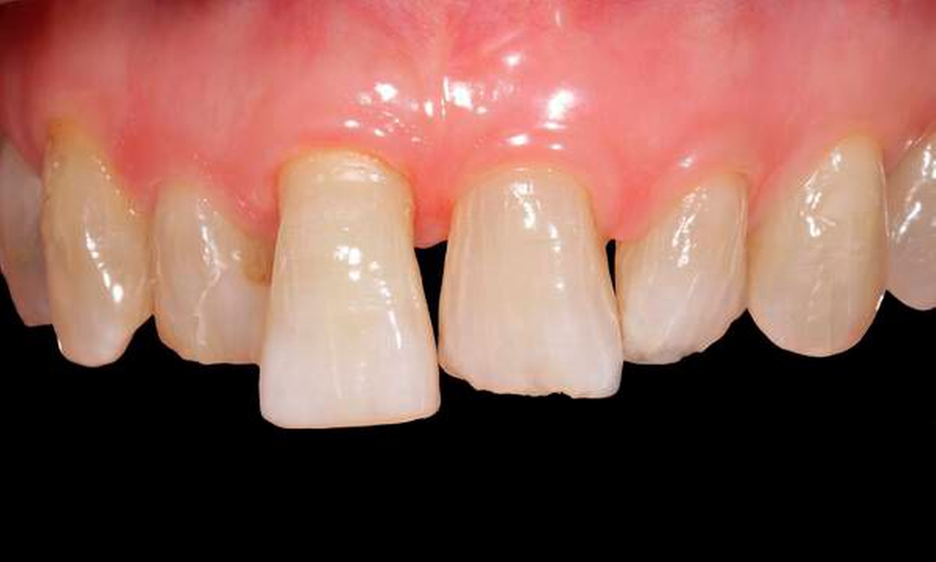 Der gelockerte Zahn 12 wurde im Zuge der Parodontalbehandlung mittels Komposit-Schienung an Zahn 11 fixiert. Die Zahnkrone 11 ist elongiert und weist einen labialen Kippstand auf. Die breite Lücke zwischen Zahn 12 und 11 ist für die Patientin zwar gut zu reinigen, jedoch ästhetisch unbefriedigend.