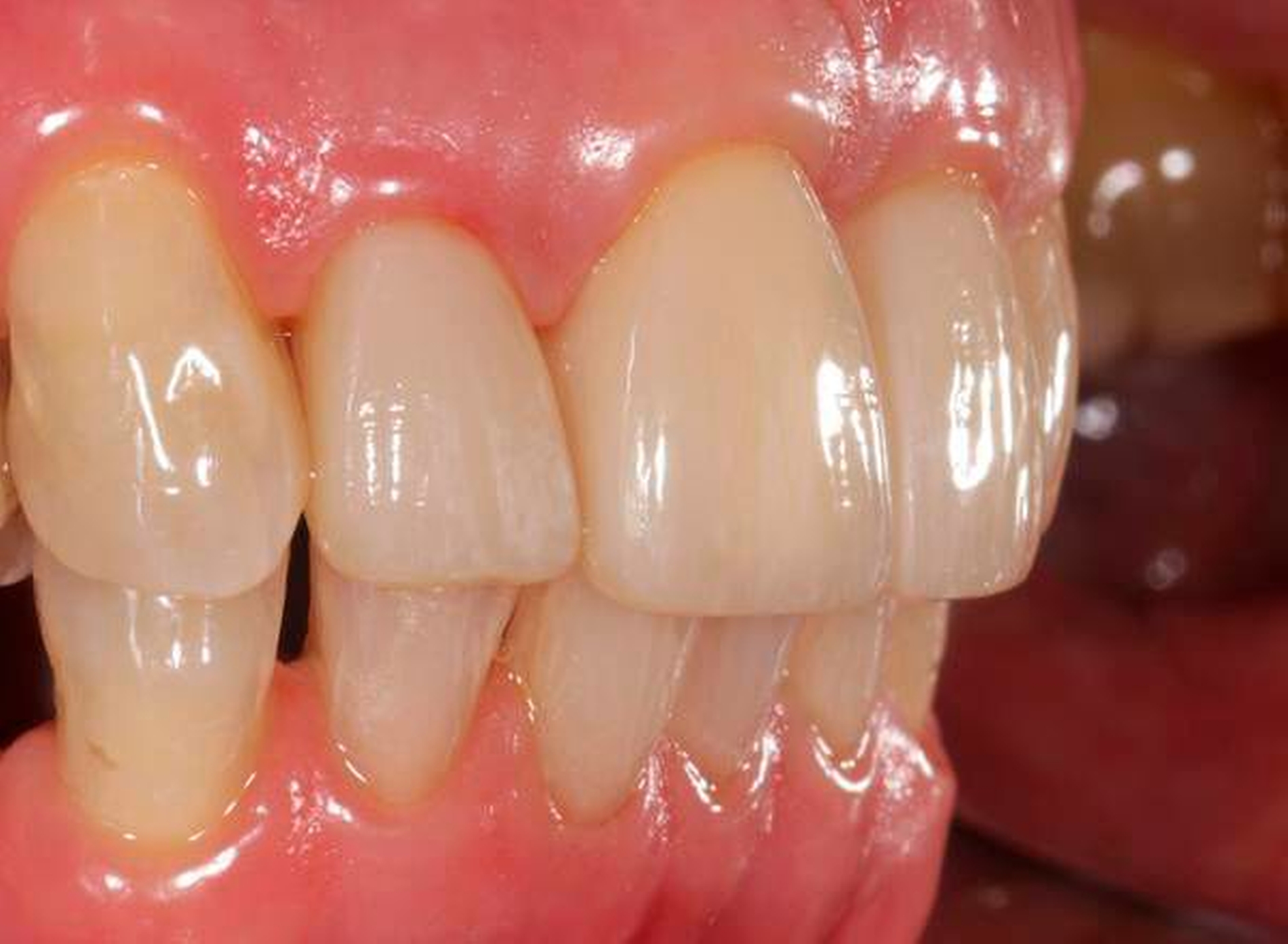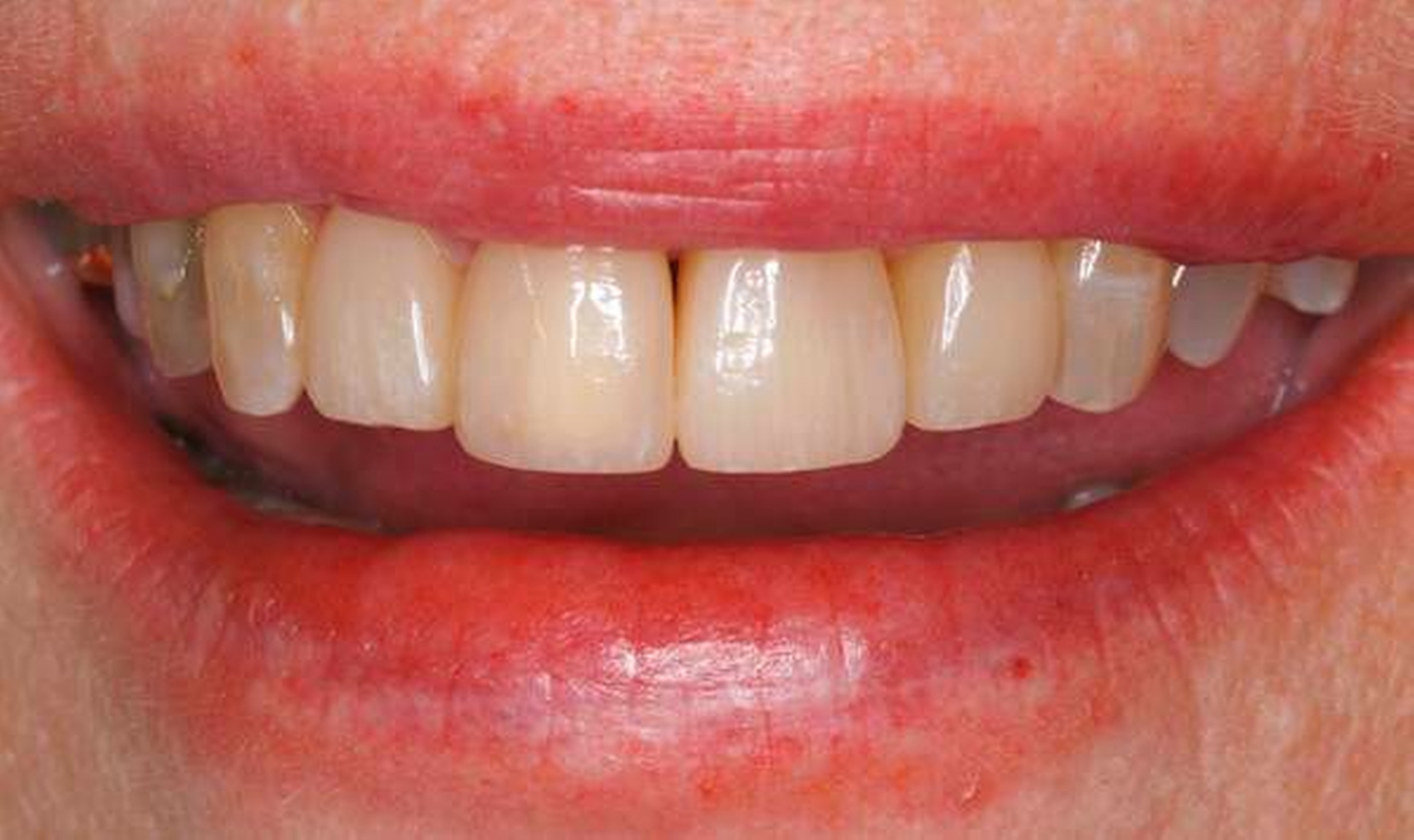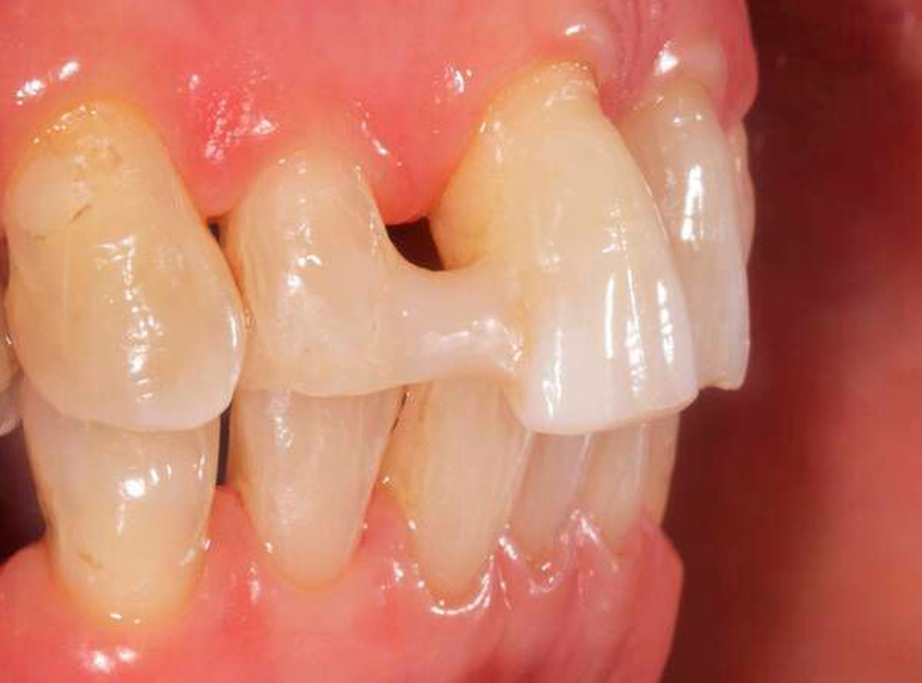 Der gelockerte Zahn 12 wurde im Zuge der Parodontalbehandlung mittels Komposit-Schienung an Zahn 11 fixiert. Die Zahnkrone 11 ist elongiert und weist einen labialen Kippstand auf. Die breite Lücke zwischen Zahn 12 und 11 ist für die Patientin zwar gut zu reinigen, jedoch ästhetisch unbefriedigend.