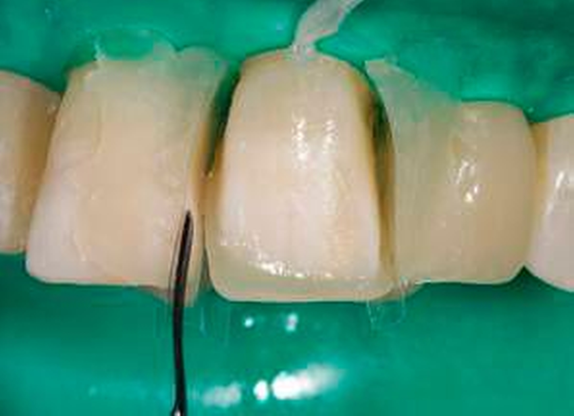 Der Silikonschlüssel mit Schmelzmasse wurde von palatinal auf den jeweiligen Frontzahn aufgesetzt und auf seinen richtigen Sitz überprüft. Die kleine Menge Flowable sollte mögliche Fehlstellen ausgleichen und stellte dadurch eine gute marginale Adaptation sicher. Die Polymerisation erfolgte zunächst von labial, nach Entfernung des Silikonschlüssels auch von palatinal.