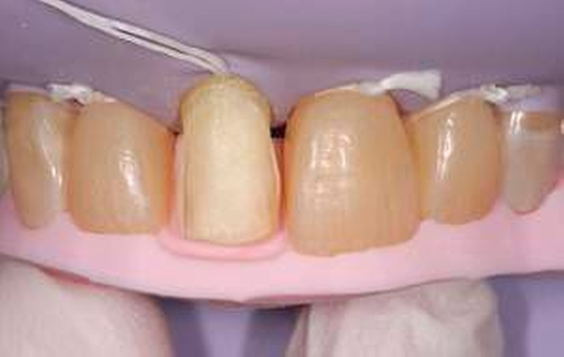 Geringe Überschüsse im palatinalen oder approximalen Bereich wurden mit einem Skalpell entfernt. Die so entstandene palatinale Wand erreichte inzisal möglichst exakt die gewünschte Ausdehnung der Restauration, sollte aber approximal noch keinen Kontakt zum Nachbarzahn haben.