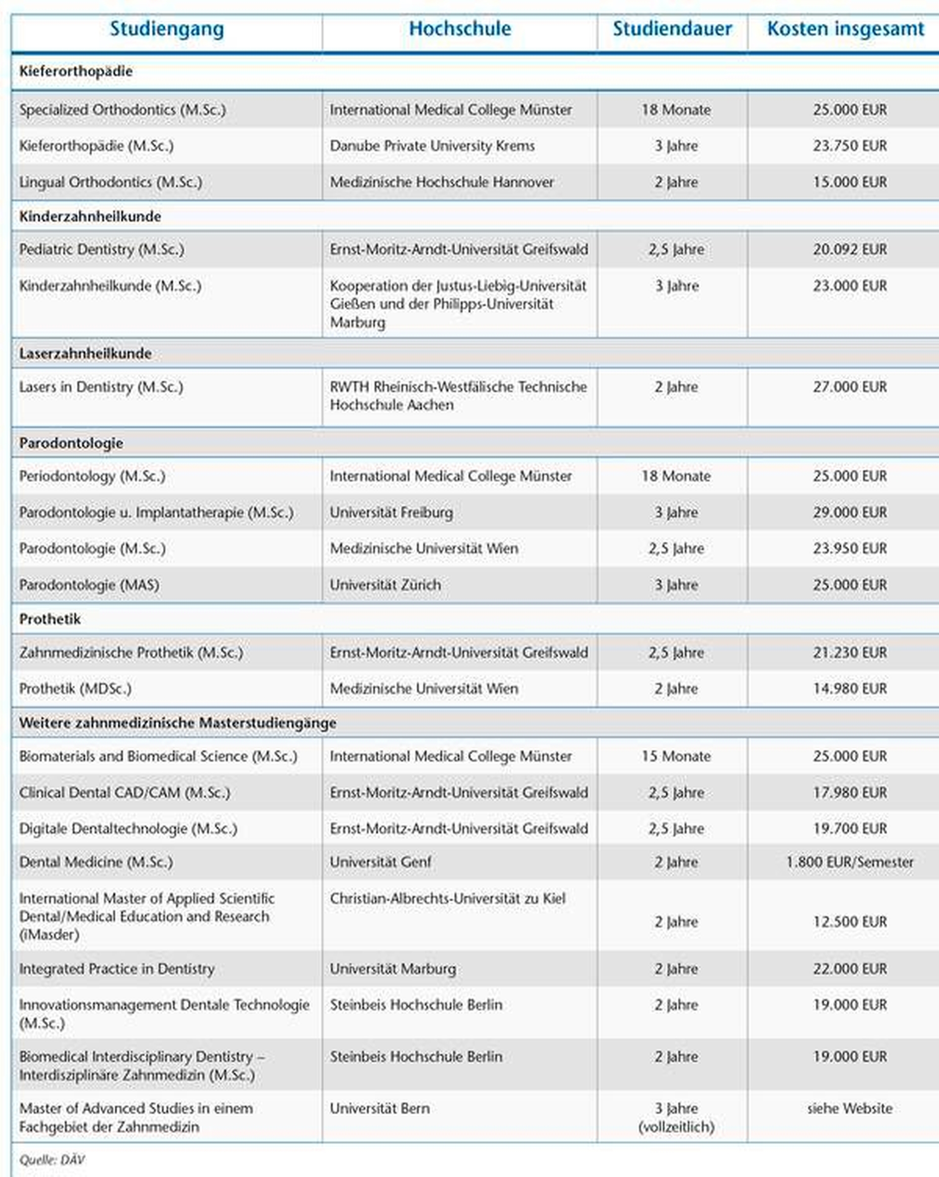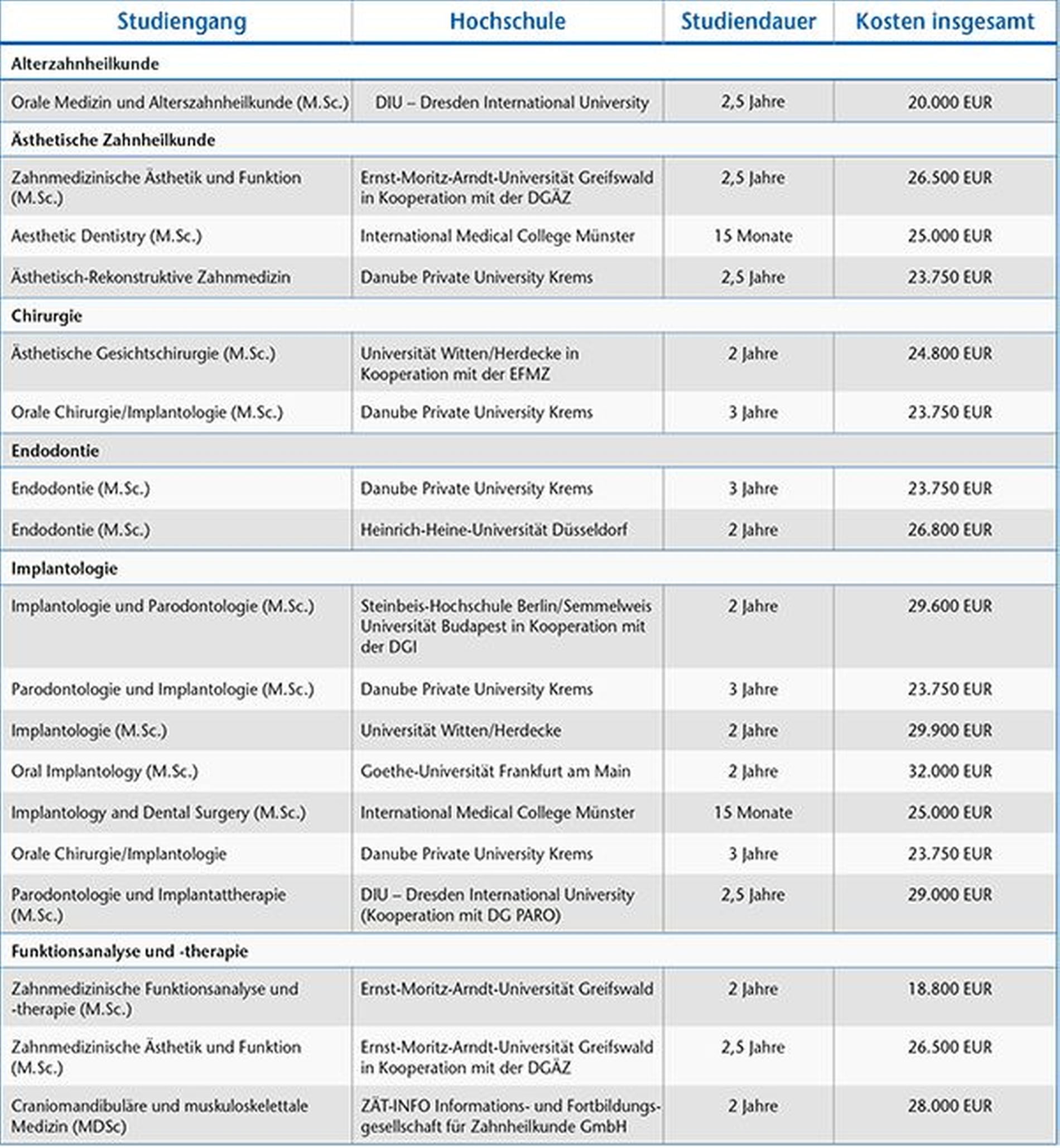 Rund ein Fünftel aller Zahnmediziner interessieren sich für eine „Spezialisierung mit formalem Abschluss“ – nach einer Studie des Instituts der deutschen Zahnärzte (IDZ) aus 2010. Wir haben alle zahnmedizinischen postgradualen Masterstudiengänge im deutschsprachigen Raum für Sie gelistet.