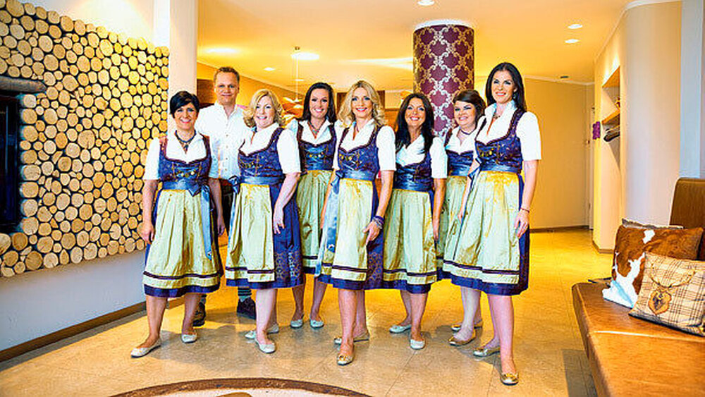 „Ich vergleiche den Dresscode für das Unternehmen Praxis gern mit einer Fluggesellschaft“, sagt sie auf Nachfrage. „Das einheitliche Outfit der Airline-Mitarbeiterinnen ist markenkonform und landestypisch ausgewählt, steht für Professionalität und repräsentiert den CI(Corporate Identity)-Anspruch des Unternehmens. Von diesem Ansatz ausgehend war es nur logisch und konsequent, dem alpinen Ambiente der Praxis in Sachen Praxiskleidung Rechnung zu tragen und die Mitarbeiterinnen mit maßgeschneiderten Trachtenoutfits auszustatten. Bei der Auswahl der Stoffe richte ich das Augenmerk auf die besonderen Praxisanforderungen im Hinblick auf die Hygienebestimmungen. Jede Mitarbeiterin erhält selbstverständlich ausreichend Kleidung zum Wechseln.“