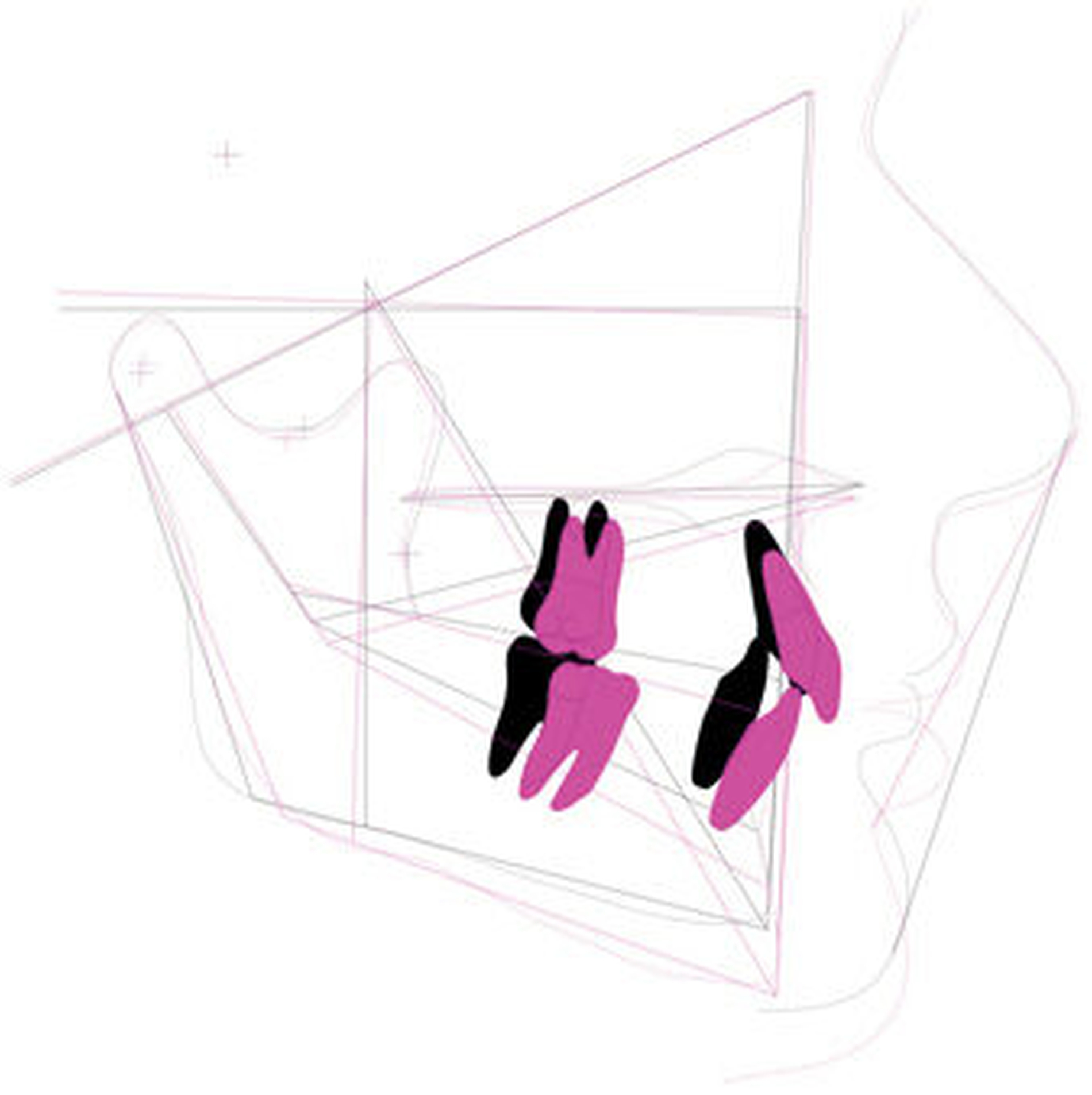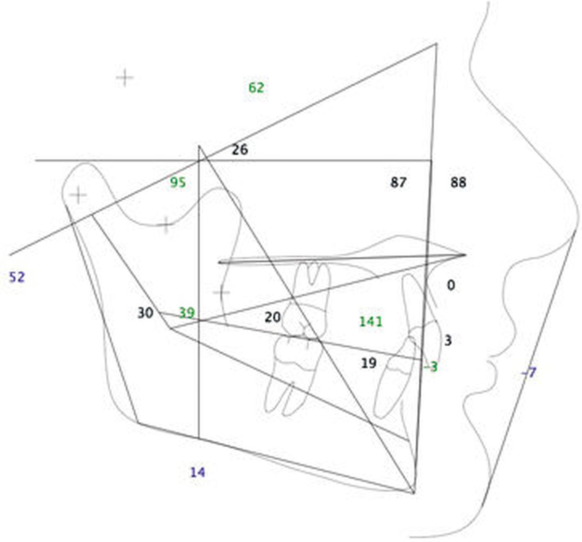 Anhand des klinischen Befunds, des Orthopantomogramms (Abbildung 3), der Durchzeichnung des seitlichen Fernröntgenbildes (Abbildung 4) und der Analyse der einartikulierten Modelle wurden folgende Diagnosen gestellt: skelettale und dentale Klasse II nach Angle (Distalbiss), Tiefbiss, Aplasie der Zähne 12, 14, 22, 34, 42, Persistenz und Infraposition der Zähne 54 und 74, Mikrodontie, starke Attrition der Oberkiefer- und der Unterkiefer-Front- und Eckzähne.