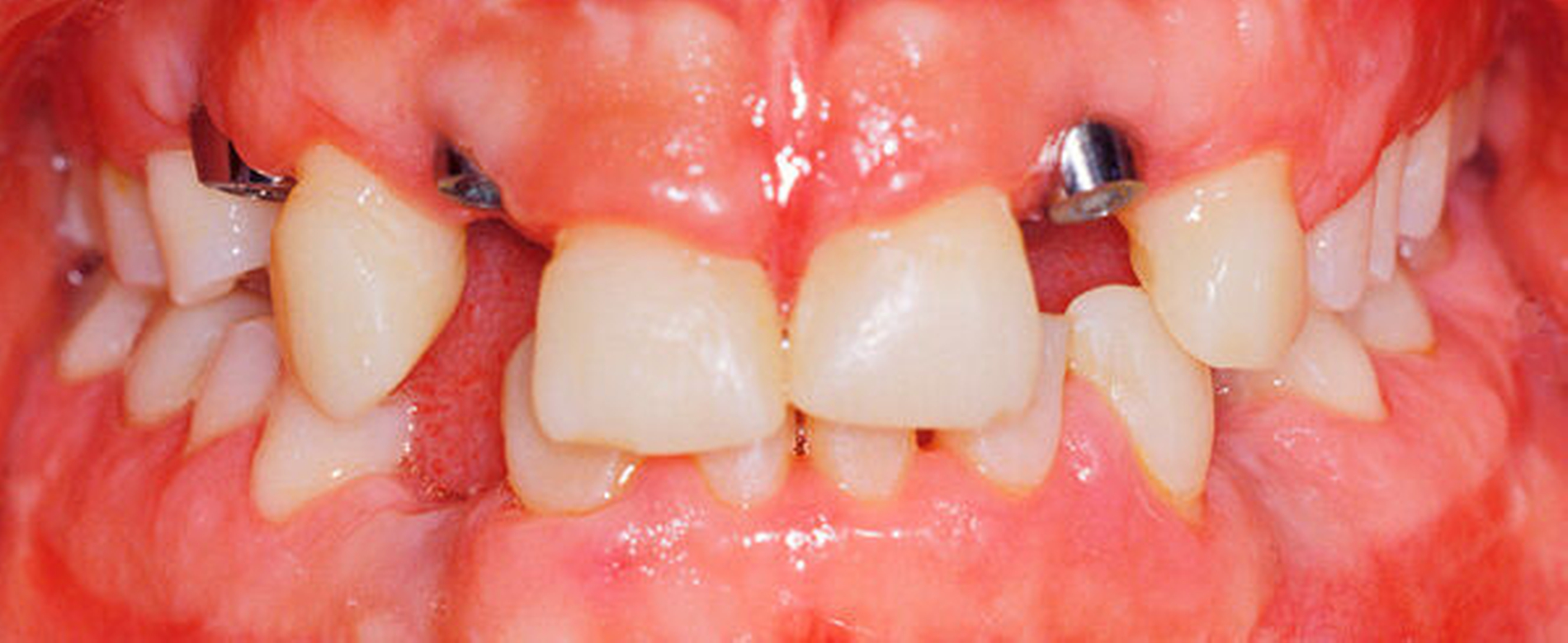 Bei einer multiplen Aplasie kann es sinnvoll sein, Implantate zum Beispiel am Gaumen in Form von subperiostalen Onplants® (Nobel Biocare) oder in der interforaminalen Region des Unterkiefers schon vor Wachstumsende einzusetzen, um herausnehmbaren Zahnersatz zu verankern und eine skelettodentale Beeinträchtigung wie zum Beispiel eine anteriore Rotation der Mandibula bei Rücklage der Maxilla zu verhindern [Bergendahl et al., 1996; Bergendahl et al., 2008; Heuberer et al., 2012; Heuberer et al., 2015].