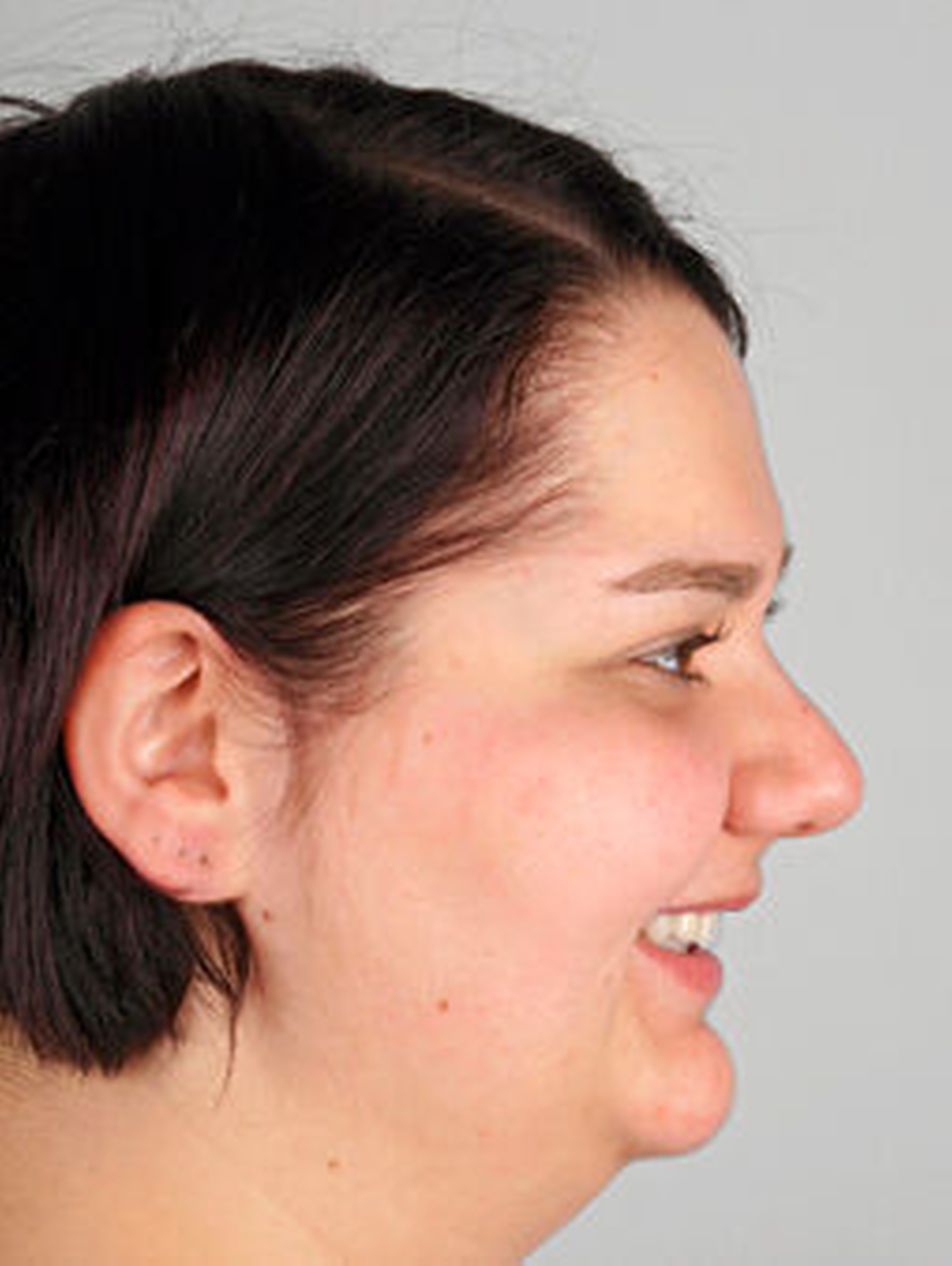 Nach Abschluss der über circa drei Jahre plangemäß verlaufenen präoperativen festsitzenden kieferorthopädischen Behandlung wurde in Allgemeinnarkose der chirurgische Eingriff durchgeführt: Oberkiefer: eine Le-Fort-I-Osteotomie in zwei Teilen mit paramedianer Osteotomie zur Oberkieferverbreiterung, Kaudalverlagerung und Korrektur einer geringgradigen Mittellinienverschiebung (nach Vorgabe der therapeutisch einartikulierten Modelle) sowie Fixierung mit Miniplattenosteosynthesen Unterkiefer: eine bilaterale sagittale Spaltungsosteotomie mit Vor-Verlagerung, Bisshebung, Stellschrauben- und Miniplattenosteosynthesen. Die Überlagerung der postoperativen Durchzeichnung des seitlichen Fernröntgens mit der Ausgangssituation veranschaulicht die skelettalen Veränderungen (Abbildung 7).