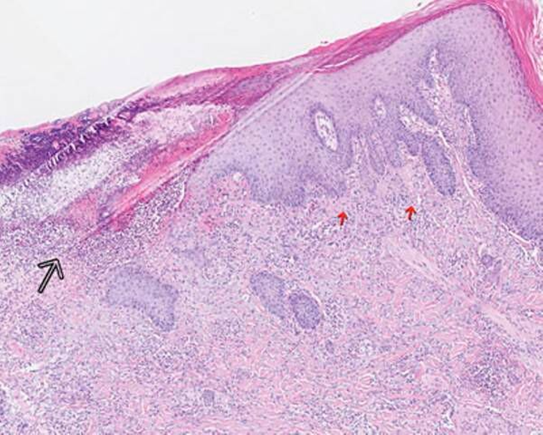 Mikroskopisch zeigten sich eine floride Ulzeration mit Fibrinexsudation und perivaskulären, entzündlichen Infiltraten mit neutrophilen Granulozyten sowie reaktive Veränderungen der Epidermis (Abbildungen 2 und 3). Auch bei einem erneuten Abstrich konnten keine Bakterien nachgewiesen werden.