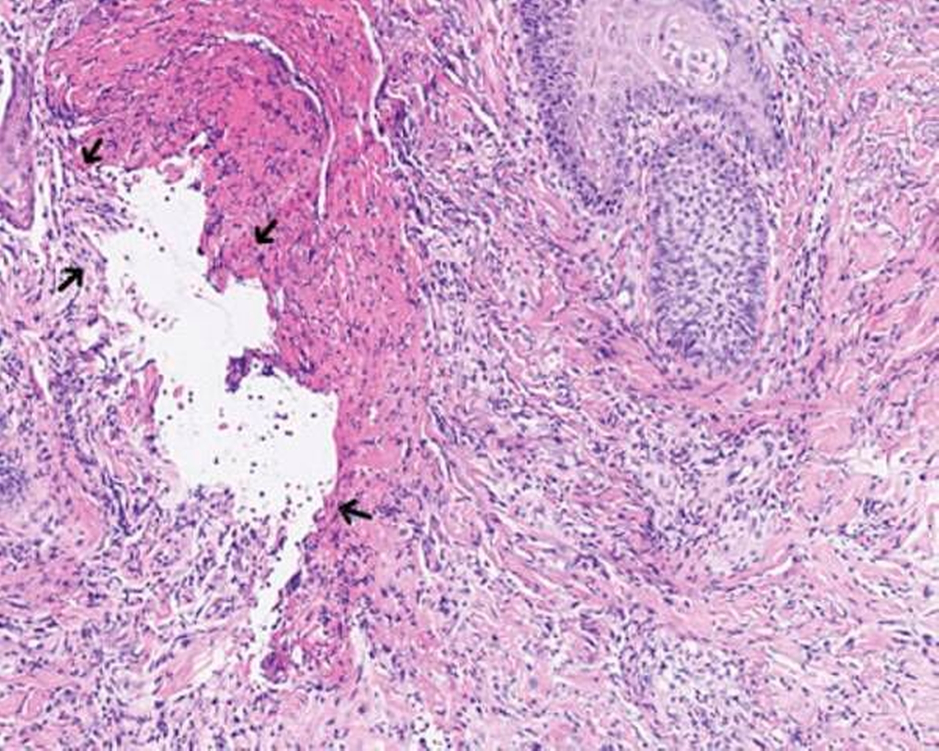 Im Spätstadium zeigt sich histologisch eine Infiltration mit neutrophilen Granulozyten sowie Hämorrhagien [Su et al., 1986; Callen et al., 1998].
