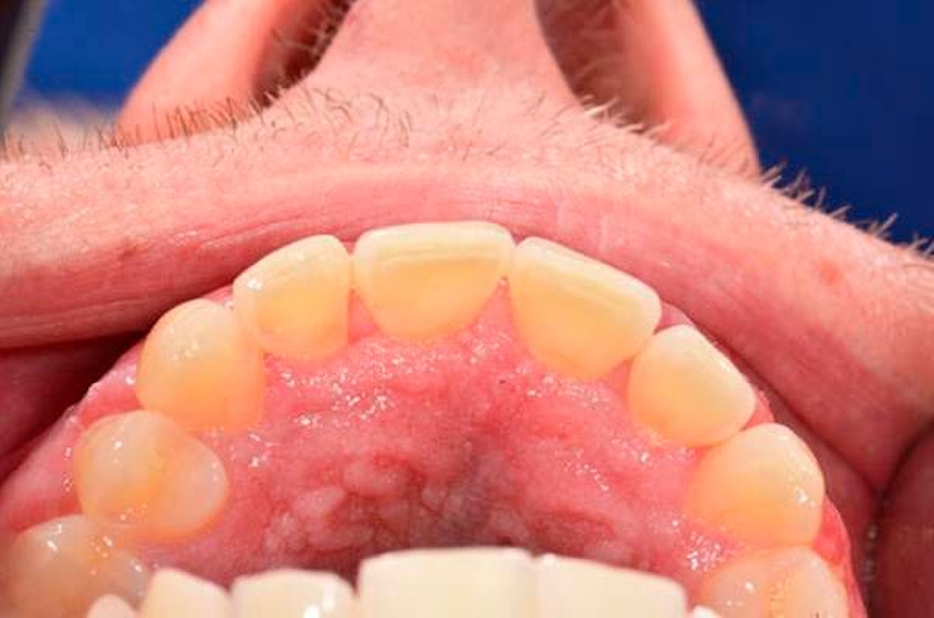 Neben der beschriebenen Läsion fanden sich oral leicht hyperplastische, papulöse Veränderungen der Gingiva vestibulär und palatinal ohne Hinweise auf Ulzerationen (Abbildungen 1 und 2). Vom klinischen Aspekt war der Befund daher gut vereinbar mit oralen Veränderungen infolge eines Morbus Crohn. Weiterhin gab der Patient eine Rötung an der Glans penis an. Der letzte Versuch einer MRT-basierten Dünndarmuntersuchung sowie einer Koloskopie und Gastroskopie scheiterte 2016 an der Compliance des Patienten.