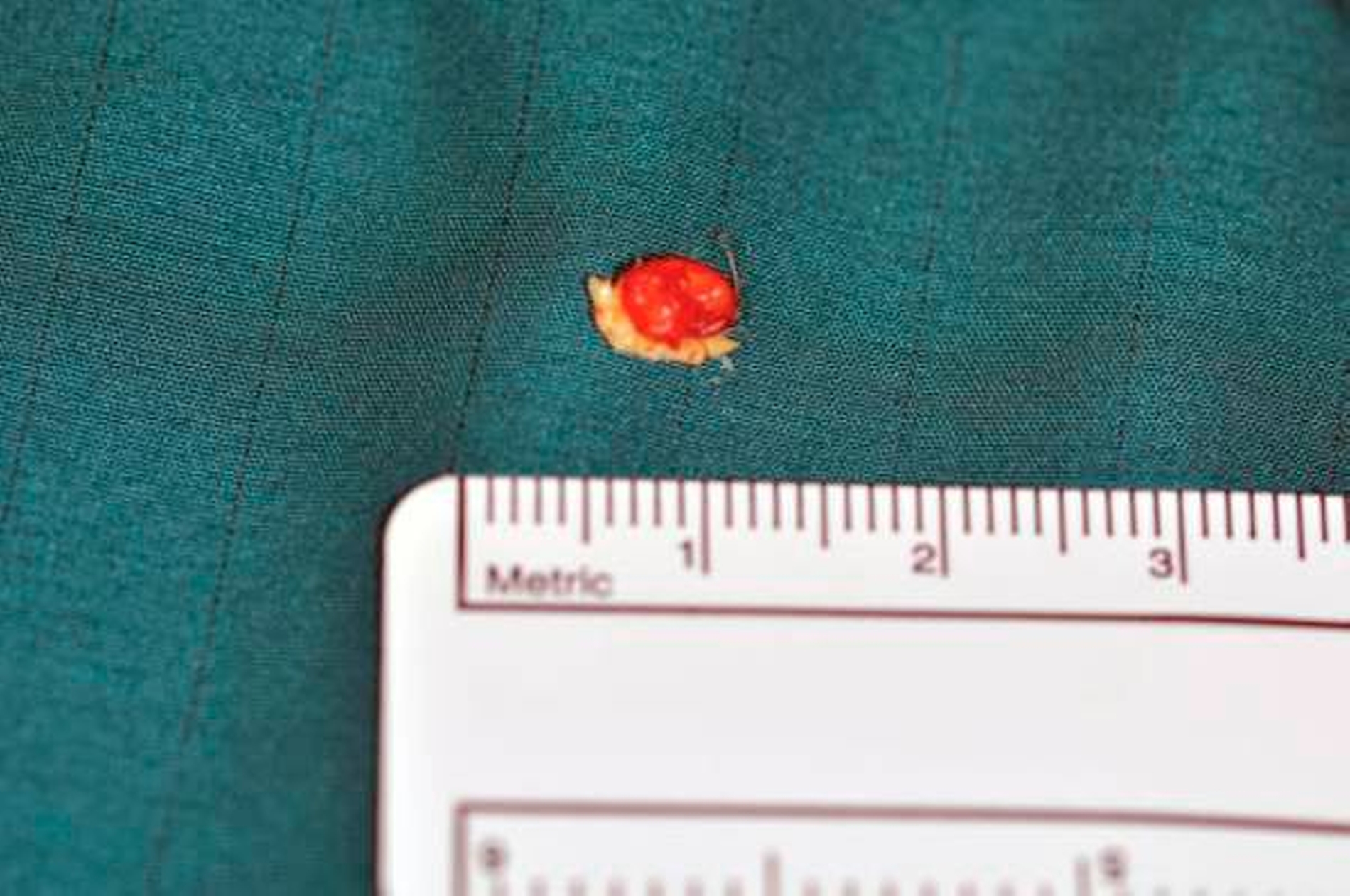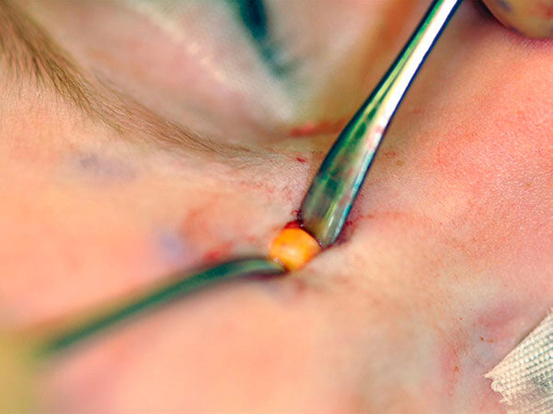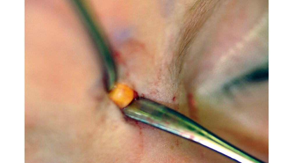 Hierbei wurde über einen minimalen, horizontal über der Glabella gelegten Schnitt die Freilegung und In-toto-Entfernung einer gelblich-kugeligen Formation durchgeführt (Abbildungen 5 und 6).