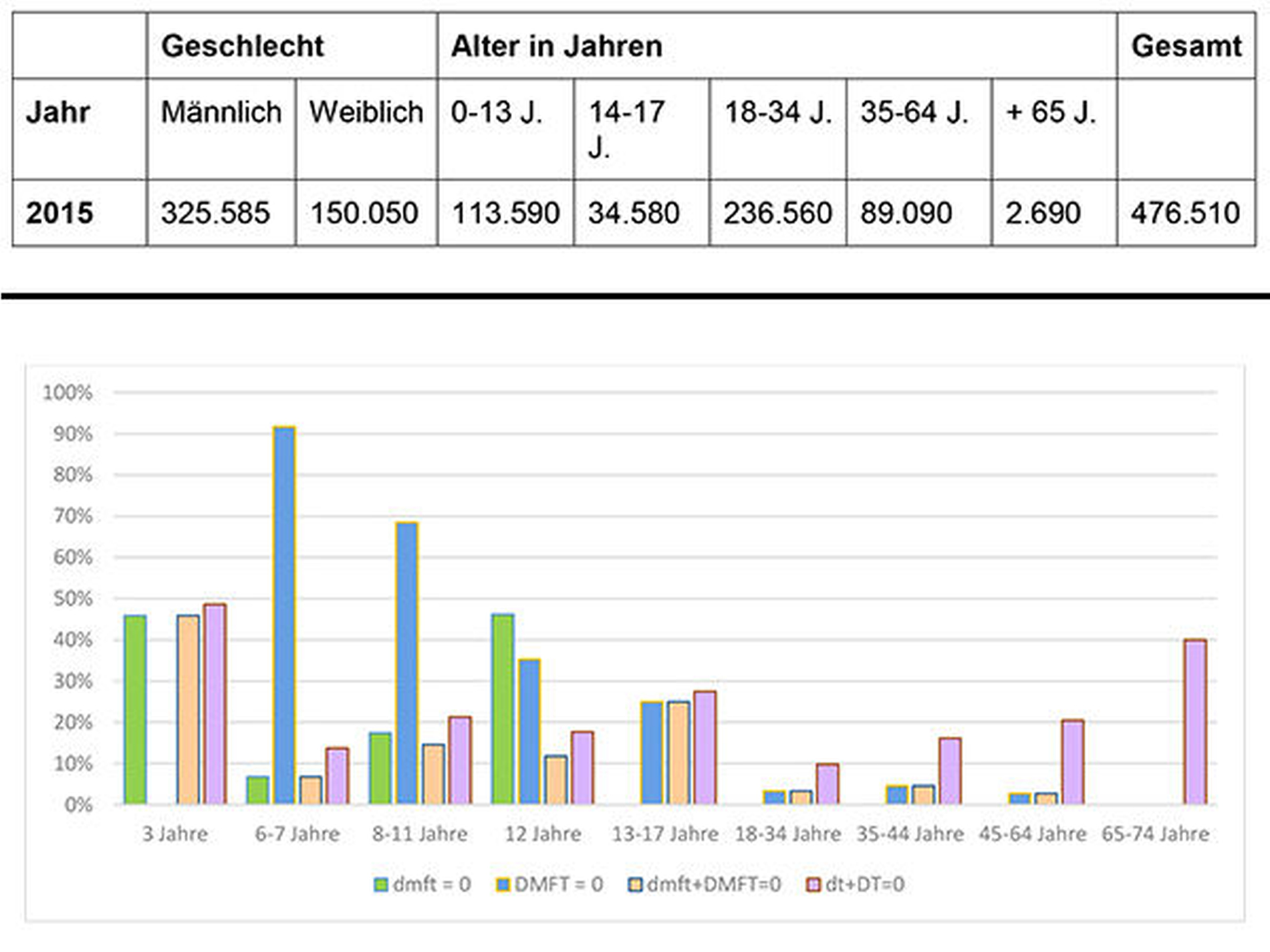 Die deskriptive Auswertung der untersuchten 544 Flüchtlinge aus allen Altersgruppen ergibt eine klare Verteilung der oralen Morbidität. Karies im Milchgebiss ist bei Flüchtlingskindern vergleichsweise hoch: