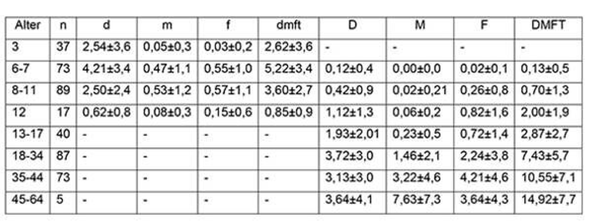 und im Alter von 6 bis 7 Jahren wird ein mittlerer Wert von 5,22 dmft erreicht.