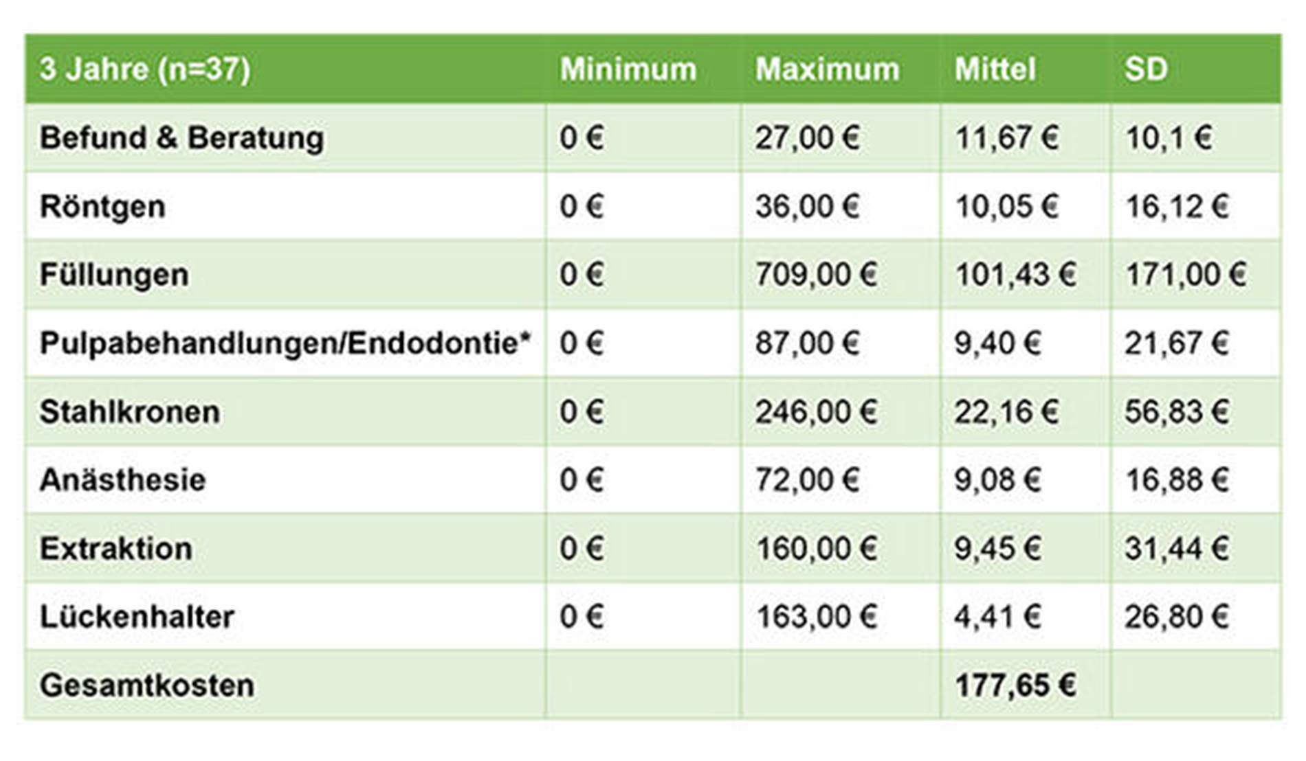 Insgesamt 544 Flüchtlinge aller Altersgruppen wurden in der von Ende 2016 bis Mitte 2017 durchgeführten Studie erfasst. Die geschätzten Kosten des Behandlungsbedarfs für eine vollständige orale Rehabilitation aller zahnmedizinischen Fachbereiche werden dabei im Mittel je nach Altersgruppe mit 178 bis 1.759 Euro pro Flüchtling beziffert.