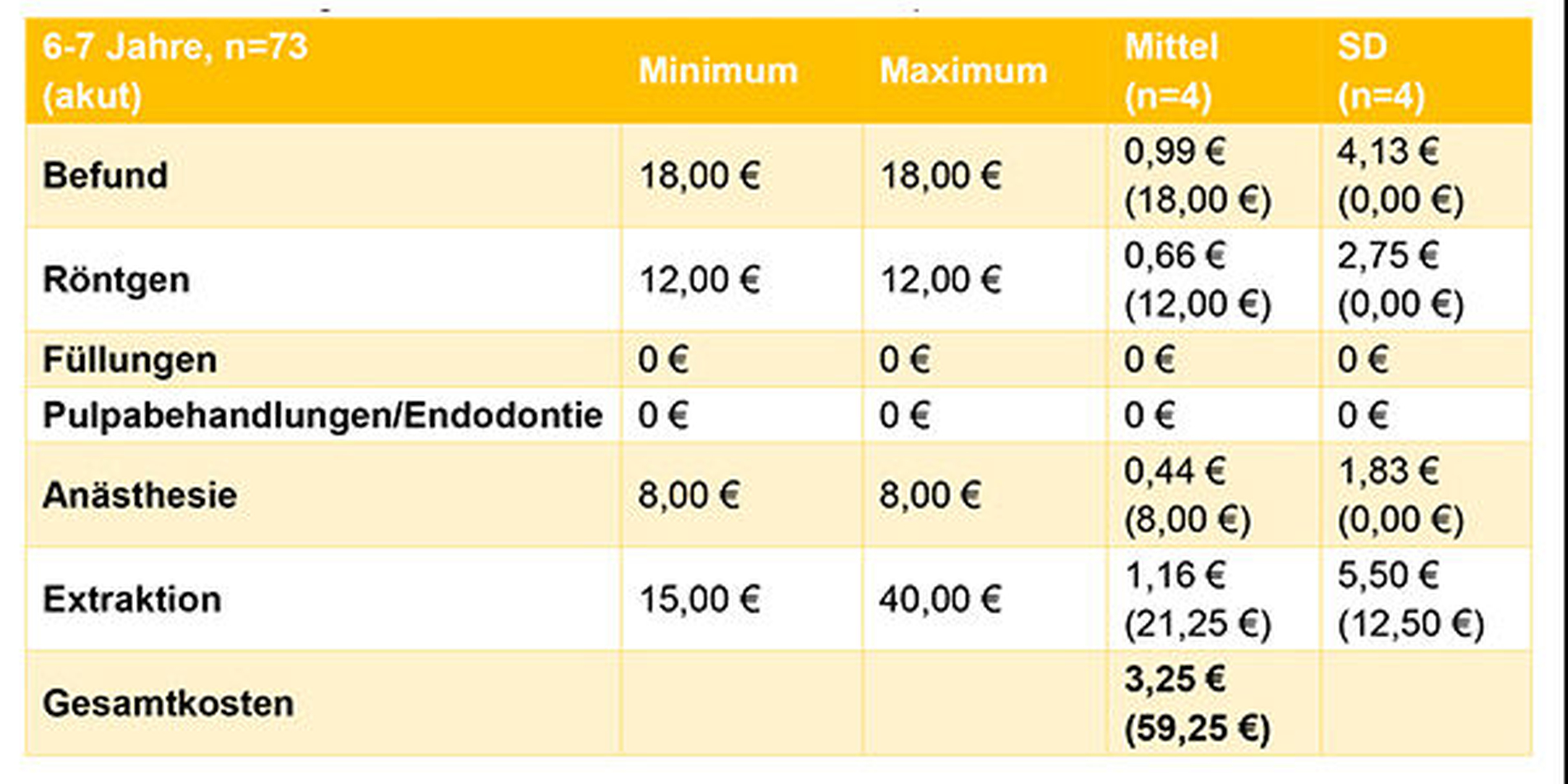 Akute Schmerzen gaben etwa 5 Prozent der Flüchtlinge zum Zeitpunkt der Untersuchung an - sie hätten im Zuge der Schmerzbehandlung nach §4 AsylbLG therapiert werden können. Die Kosten für mehrheitliche Füllungen oder Extraktionen lagen pro Fall im Mittel zwischen 59 und 297 Euro je nach Altersgruppe. Bei der großen Mehrheit der Flüchtlinge wurde eine zusätzliche, nicht therapierte orale Morbidität ermittelt - vor allem multiple offene kariöse Defekte, die durch Füllungen, Extraktionen und gegebenenfalls auch Wurzelkanalbehandlungen einschließlich Begleitleistungen behandelt werden könnten.