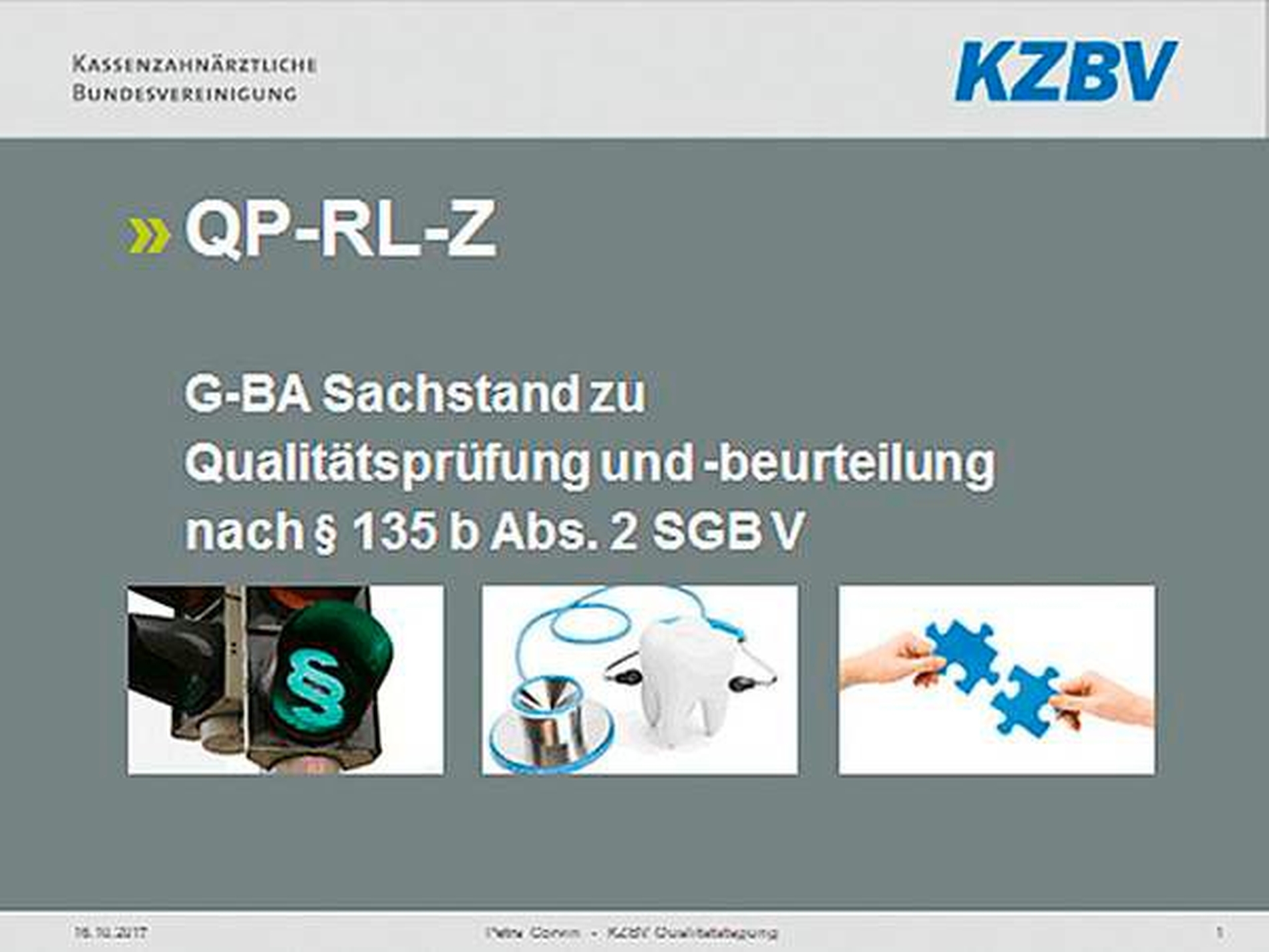 Die KZBV ist im Unterausschuss QS des G-BA aktiver Partner und bringt ihre Expertise in die Beratungen mit ein. Ziel ist es, das Interesse der Kollegenschaft dort sachgerecht zu vertreten und die Belastungen für die Praxis so gering wie möglich zu halten. Auch sollten Aufwand und Umfang der für die Qualitätsprüfung notwendigen Strukturen in einem vertretbaren, schlanken Rahmen bleiben. Ihre eigenen, auf den Berufsstand zugeschnittenen Empfehlungen zur Qualitätsförderung in Praxen hatte die KZBV bereits 2016 in einer eigenen „KZBV Qualitätsförderungsrichtlinie“ formuliert, die als Richtschnur für die Verhandlungen im G-BA diente.