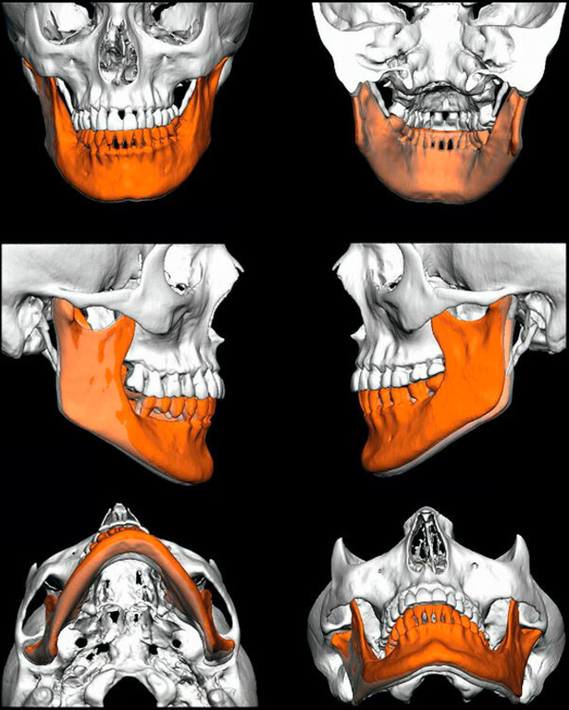 Im ersten Schritt wurde zunächst die Okklusion virtuell wiederhergestellt (Abbildung 2b), anschließend konnte das bilateral zu resezierende knöcherne Gewebe markiert und bestimmt werden (Abbildung 2c).