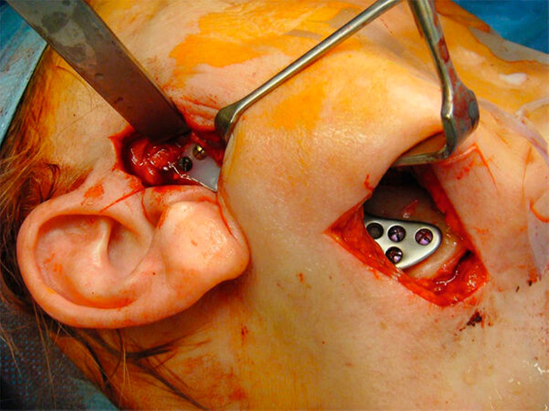 Auf dieser Basis erfolgte die Erstellung einer Totalendoprothese im patientenindividuellen Design (Abbildung 2d). Daraufhin wurden virtuell die Cutting-Guides für den Unter‧kiefer geplant. Anschließend wurde beidseits die Implantation der Kiefergelenk-‧Totalendoprothese (CAD/CAM-gefertigte Komponenten, Biomet-System©) vorgenommen. Abbildung 3 demonstriert das chirurgische Vorgehen.