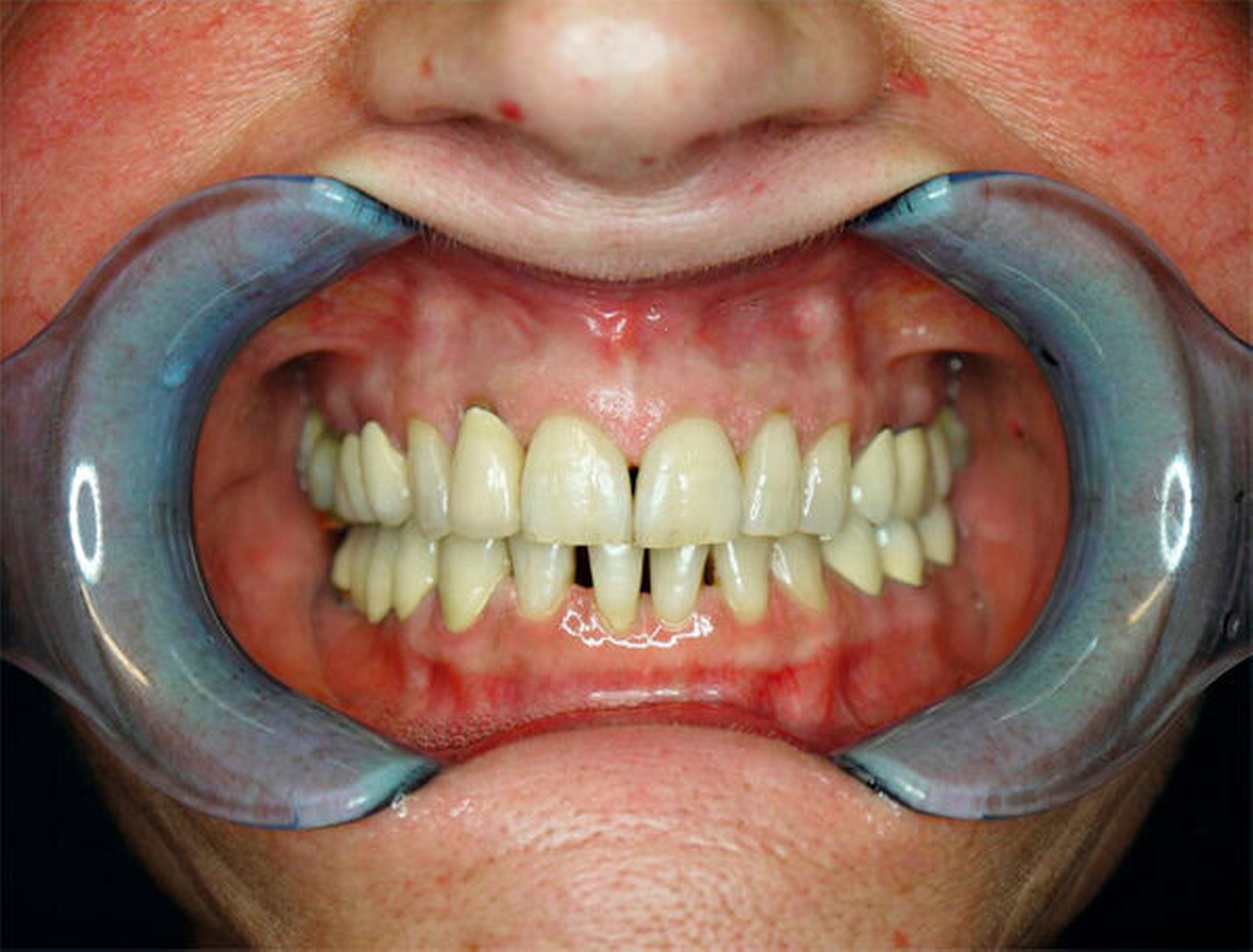 Bei einer 54-jährigen Patientin wurde zwei Jahre vor der Erstvorstellung in unserer MKG-Klinik eine chronisch rheumatoide Arthritis diagnostiziert. Nachdem der Rheumatologe die Diagnose gestellt hatte, bestand die Notwendigkeit einer ausgeprägten prothetischen Zahnsanierung durch den Hauszahnarzt. Etwa sechs Monate nach Fertigstellung beklagte die Patientin einen nicht gut sitzenden Zahnersatz mit der Entwicklung eines offenen Bisses (Abbildungen 1a und 1b).
