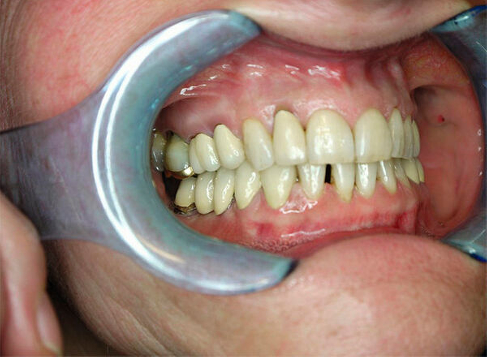 Bei einem inzwischen fünfjährigen Nachsorgeintervall ist sie beschwerdefrei und vollkommen uneingeschränkt in der Nahrungsaufnahme (Abbildungen 4a und 4b). Alle physiologischen Bewegungen einschließlich der Laterotrusionsbewegung des Unterkiefers sind möglich.