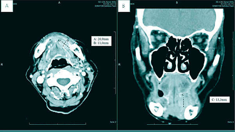 Zum Ausschluss eines Sjögren-Syndroms erfolgte zunächst eine Blutabnahme mit Antikörperbestimmung (antinukleäre Antikörper (ANA), SSA-Ak (Anti-Ro) und SSB-Ak (Anti-La)). Darüber hinaus wurde eine komplementäre Bildgebung (Computertomografie) durchgeführt. Bei der Antikörperbestimmung waren lediglich die ANA mit 1:360 (Norm 1:80) erhöht. Im CT zeigte sich die Glandula sublingualis links glatt begrenzt und homogen kontrastmittelanreichernd mit einer Gesamtgröße von circa 2,1 cm x 1,1 cm x 1,4 cm (Abbildungen 1a und 1b).