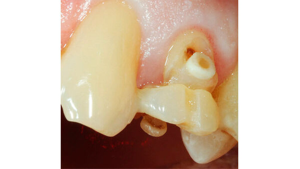13 | Repositionierung der Wurzelscheibe/n minimal suprakrestal (Abb. 7) mit adhäsiver Wiederbefestigung der klinischen Restkrone an den Nachbarzähnen und Auffüllen des offenen Bereichs mit Komposit zur ästhetischen Maskierung und zum Schutz der Wurzelscheibe/n vor Zungen- und Wangendruck |