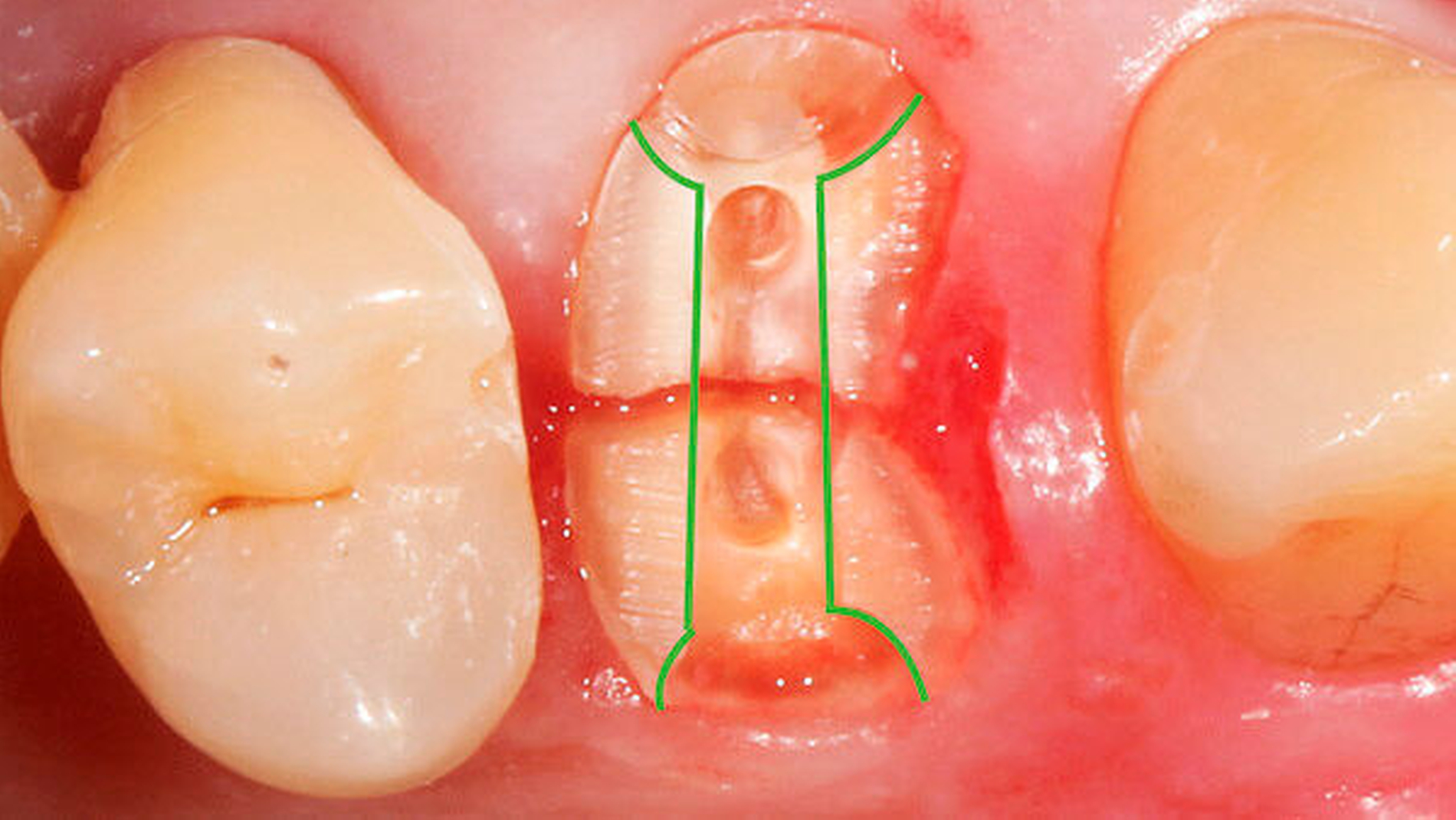 Grundsätzlich gilt, dass innerhalb der Retentionsphase der natürliche Zahn – alternativ die Wurzelscheibe – als induzierender Faktor für die Reossifikation der apikalen Extrusionshöhle dient. Dieser Prozess wird als Dentointegration in der Literatur umschrieben [Silva TA. et al., 2004; Schwarz F. et al., 2016]. Knochenhöhlen in direktem Kontakt zu Dentin weisen eine deutlich höhere Reossifikationsrate auf als Knochendefekte ohne dentointegrativen Stimulus.