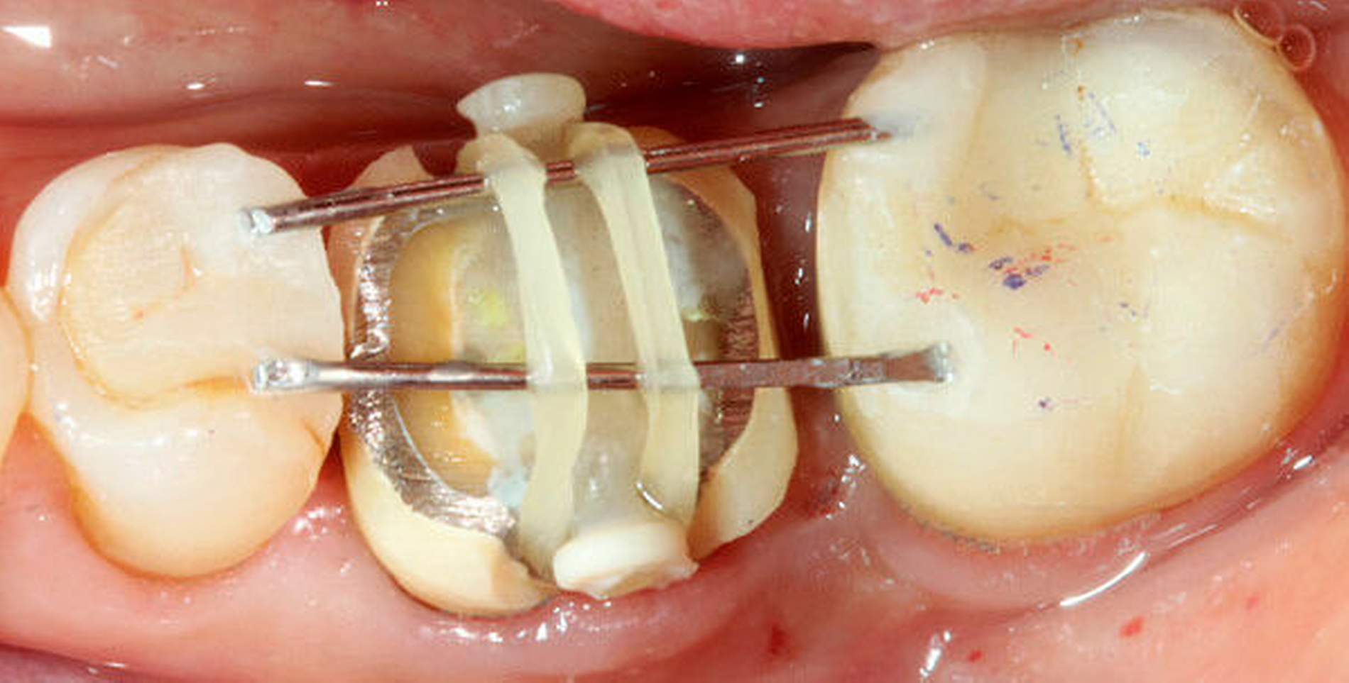 6 | Adhäsive Fixierung des koronalen 1/3 der ursprünglichen Krone (Frontzahnbereich. Abb. 3) oder der Extrusionsstege (Klammerdraht oder Extrusionssteg Fa. Komet) an den Nachbarzähnen |