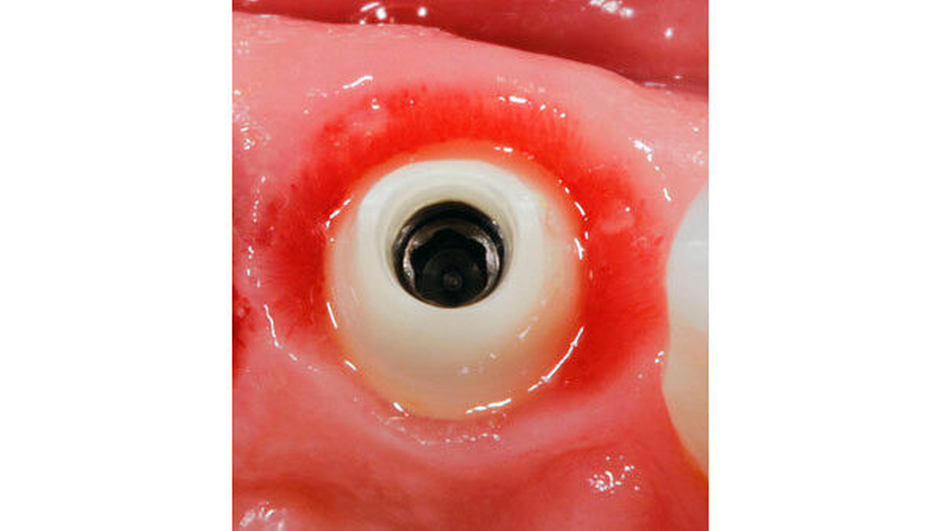 Unter der replantierten Wurzelscheibe an Zahn 21 (Abbildung 16) erfolgte in nur acht Wochen eine vollständige Knochenregeneration der Alveole. Dabei blieb auch der bukkale Hart- und Weichgewebsanteil vollständig erhalten. Nach Entfernung der Scheibe war für eine optimale Positionierung des Implantats in allen Dimensionen ausreichend Knochen vorhanden (Abbildungen 17 und 18).