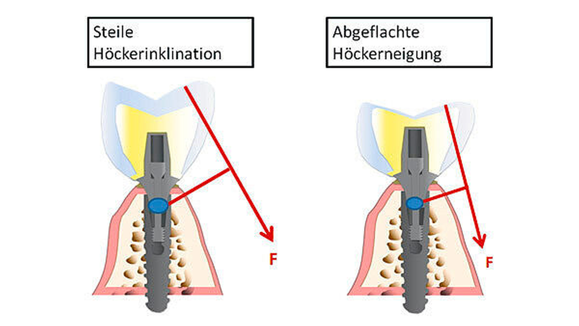 Die modifizierte okklusale Gestaltung des implantatgetragenen Zahnersatzes soll einen möglichst parallel zum Implantat ansetzenden Kraftarm ermöglichen. Demnach führt eine Reduzierung der Höckerneigung zu einer axialeren Belastung des Implantats (Abbildung 3). Eine Verzahnung der implantatgetragenen Suprastrukturen im Oberkiefer im Kopf- (zweiter Prämolar) oder gar im Kreuzbiss (ab dem ersten Molar) soll die exzentrischen Kräfte weiter minimieren.