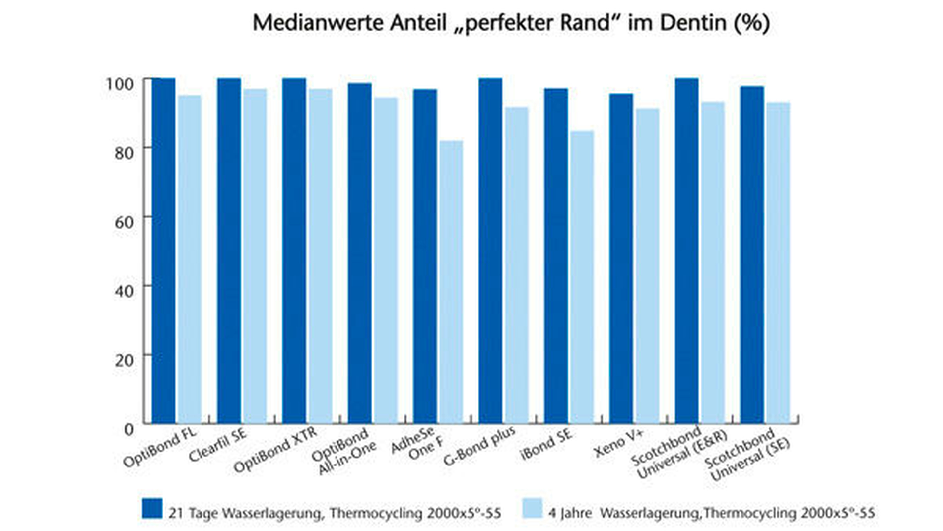 Obwohl die Spaltfreiheit von Füllungsrändern ein wichtiges Kriterium für die Bewertung von Bondingsystemen darstellt, ist dazu die Datenlage für Universaladhäsive sehr dürftig. Blunck und Preissner [2015] untersuchten bei Klasse-V-Füllungen den Anteil „perfekter Rand“ (PR) im Dentin nach Wasserlagerung für 21 Tage und für 4 Jahre. Abbildung 4 zeigt die Ergebnisse für eine Auswahl der dort untersuchten Produkte. Ein Vertreter aus der Gruppe der Universal-adhäsive (Scotchbond Universal) zeigte initial im ER-Modus eine perfekte Randadaptation (100 Prozent PR) und im SE-Modus nur geringfügige Randimperfektionen (97,7 Prozent PR). Nach vierjähriger Wasserlagerung wurde mit beiden Ätzmodi (jeweils etwa 93 Prozent PR) keine signifikante Verschlechterung der Dentinrandqualität registriert. Damit verhielt sich dieses Universaladhäsiv ähnlich zuverlässig wie bewährte Mehrschrittsysteme.