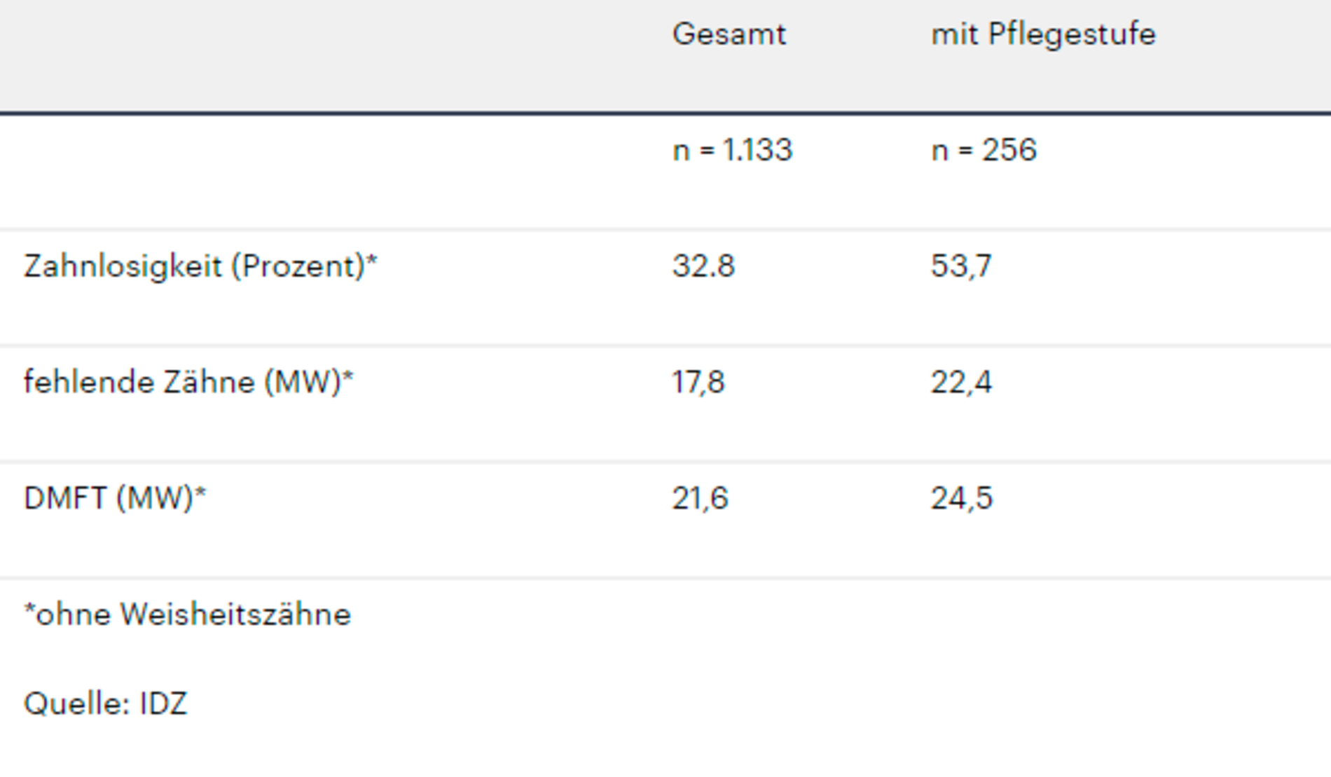 2012 legte das IDZ eine systematische Übersicht zur Mundgesundheit von Pflegebedürftigen und Menschen mit Behinderungen in Deutschland vor. Grundlage waren aktuelle Einzelstudien [1, 2]: Zehn regionale Studien aus 2000 bis 2012 wurden für Menschen mit Pflegebedarf einbezogen. Einerseits wurde dabei bereits klar, dass die Mundgesundheit dieser vulnerablen Gruppen im Vergleich zur Allgemeinbevölkerung in Deutschland kompromittiert ist. Andererseits machte die Literaturübersicht deutlich, dass auf diesem Gebiet ein erheblicher Forschungsbedarf besteht. Aus diesem Grund wurde die Fünfte Deutsche Mundgesundheitsstudie (DMS V) um die systematische Untersuchung der 75- bis 100-Jährigen – mit Schwerpunkt auf Menschen mit Pflegebedarf – mithilfe eines entsprechenden oralepidemiologischen Altenmoduls ergänzt: 22,6 Prozent waren in dieser Altersgruppe, den älteren Senioren, pflegebedürftig. Davon lebten 30,7 Prozent zum Erhebungszeitpunkt in stationären Einrichtungen und 69,3 Prozent in häuslicher Pflege – Zahlen, die sehr gut mit den Ergebnissen des Statistischen Bundesamtes [3] korrelieren. Diese Übereinstimmung und die Tatsache, dass auch diese Studienteilnehmer konsequent über eine Zufallsstichprobe der Einwohnermeldeämter rekrutiert wurden, sind ein starker Anhaltspunkt für valide Daten zur oralen Gesundheit in dieser Studie, auch der Menschen, die in stationärer Pflege leben.