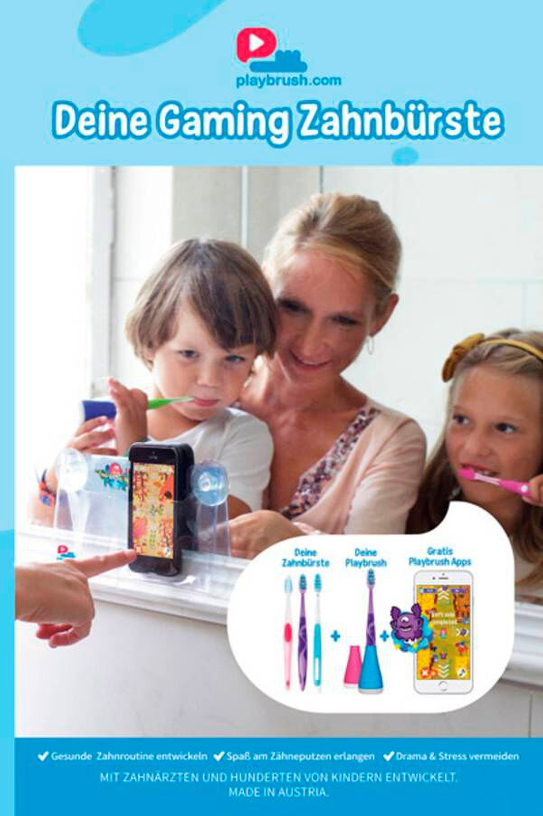 Bei der PlayBrush handelt es sich um einen Zahnbürstenaufsatz für Handzahnbürsten, der sich per Bluetooth mit einer App auf Smartphone oder Tablet verbinden lässt und so Zugriff auf vier verschiedene Spiele schafft. Die Idee hinter Playbrush ist, „lästige Routine in ein spannendes Spiel zu verwandeln“, damit „Kinder endlich Spaß am Zähneputzen haben“ und „die Wichtigkeit der Zahnhygiene auf spielerische Art verstehen“. Zahnputzmonster werden gejagt, Bilder gemalt und Heißluftballons geflogen, indem man die Zahnbürste durch alle vier Quadranten führt. So will der Hersteller garantieren, dass durch zweimal am Tag Putzen für je zwei Minuten alle Zähne erreicht werden, damit „Angst vor dem Zahnarzt und hohe Behandlungskosten“ der Vergangenheit angehören.