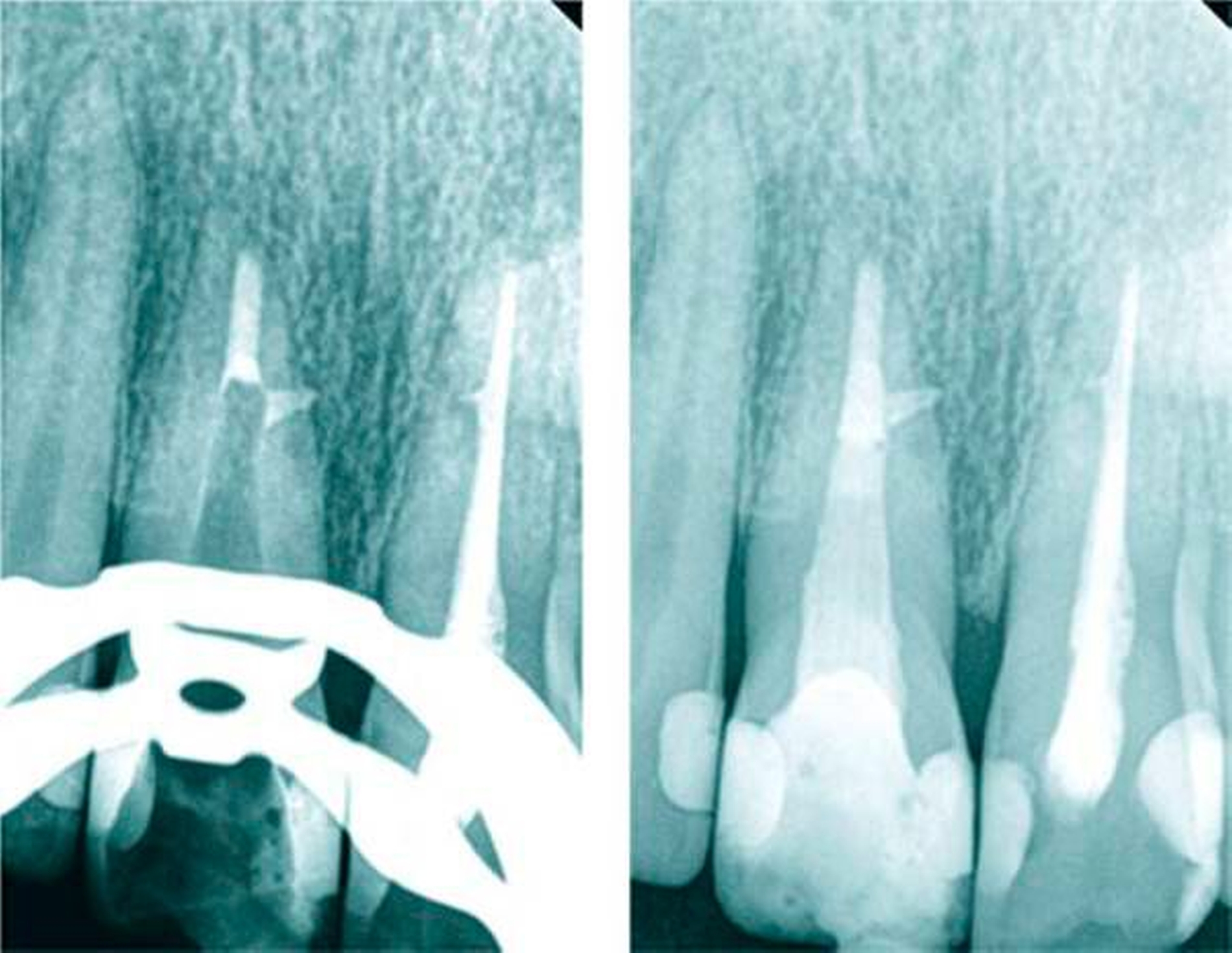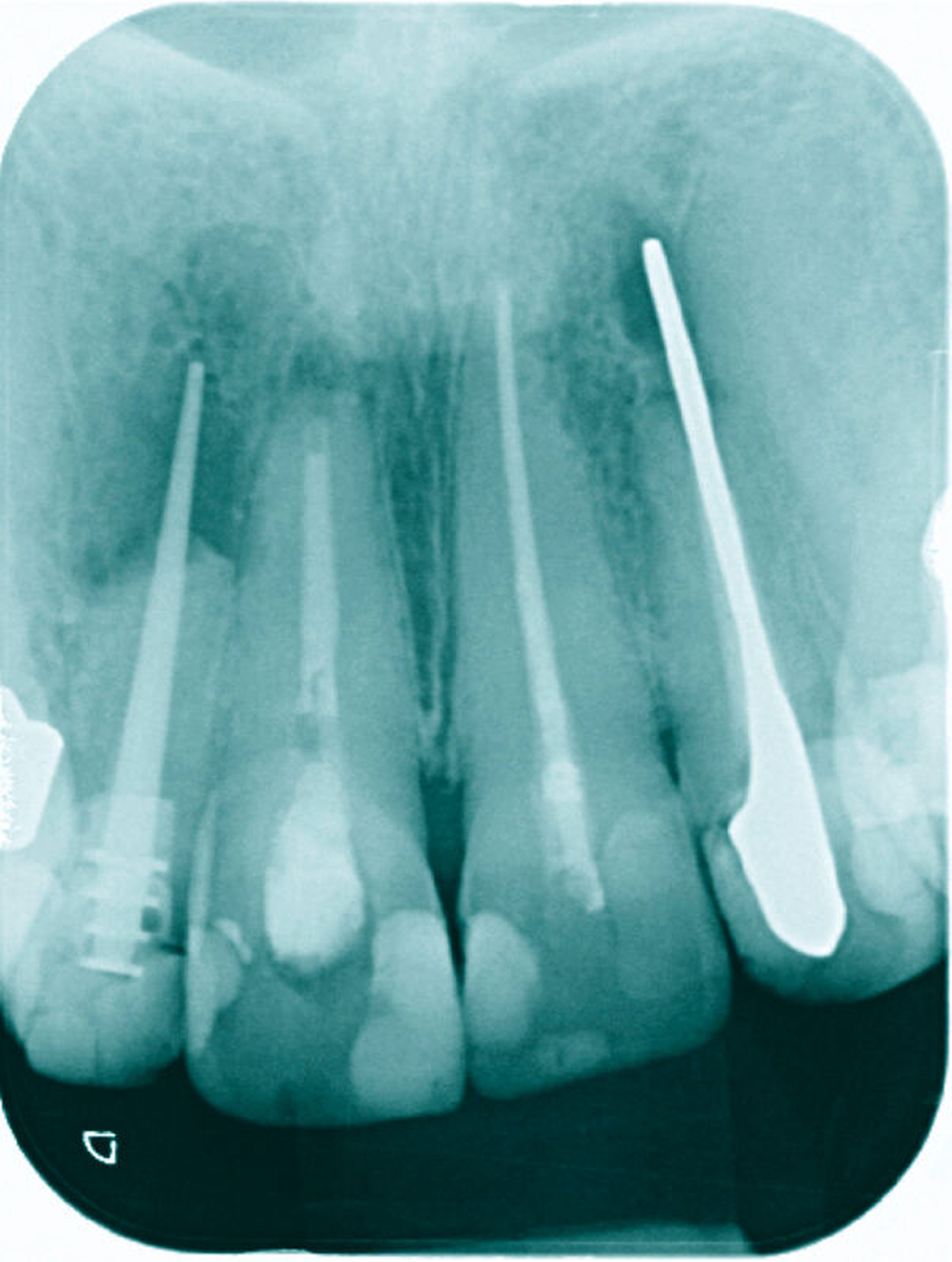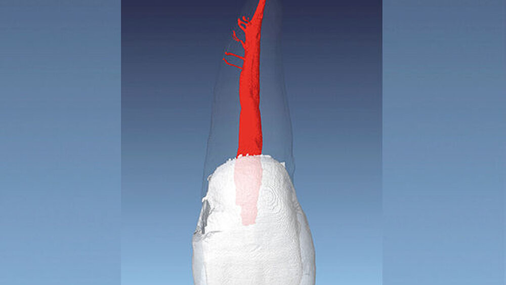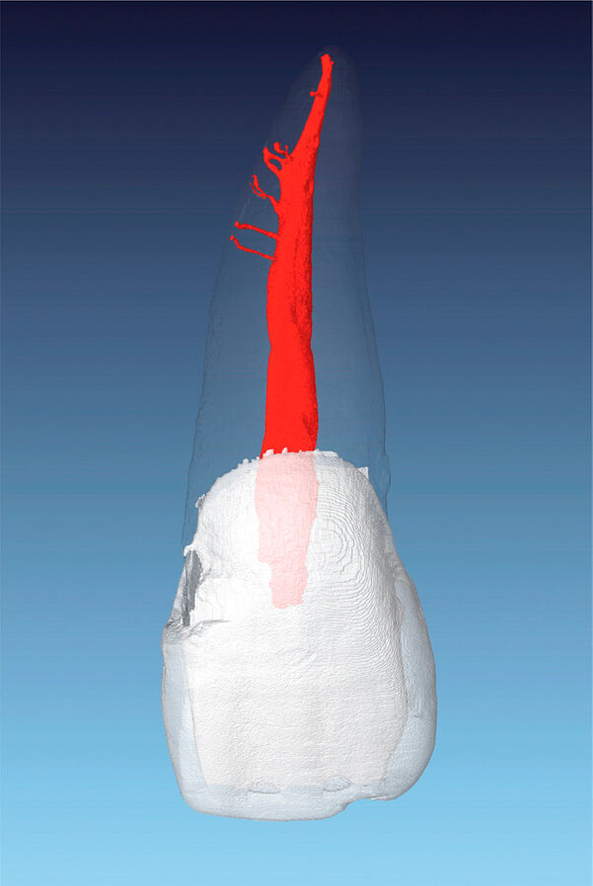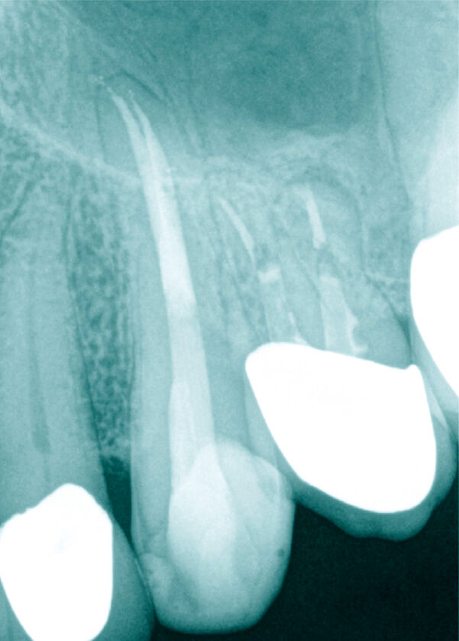 Oberkiefer-Frontzähne sind grundsätzlich einwurzlig. Abweichungen treten in nur seltenen Fällen auf. Der Querschnitt von Wurzel und Wurzelkanal variiert von koronal nach apikal. Während der Wurzelkanalquerschnitt am Boden der Pulpakammer eine rundliche Form aufweist, kann er sich im weiteren Verlauf oval erweitern und sich in Richtung palatinal ausdehnen. Der durch den Dentinüberhang instrumentell meist nicht zugängliche Bereich der palatinalen Wurzelkanalwand bleibt deshalb häufig mechanisch und chemisch unbehandelt und bildet ein Reservoir für mikrobiell infizierte Gewebe. In seltenen Fällen können sich im ovalen Wurzelkanalanteil durch die Bildung einer Dentinbrücke zwei Wurzelkanäle entwickeln (Abbildung 3)