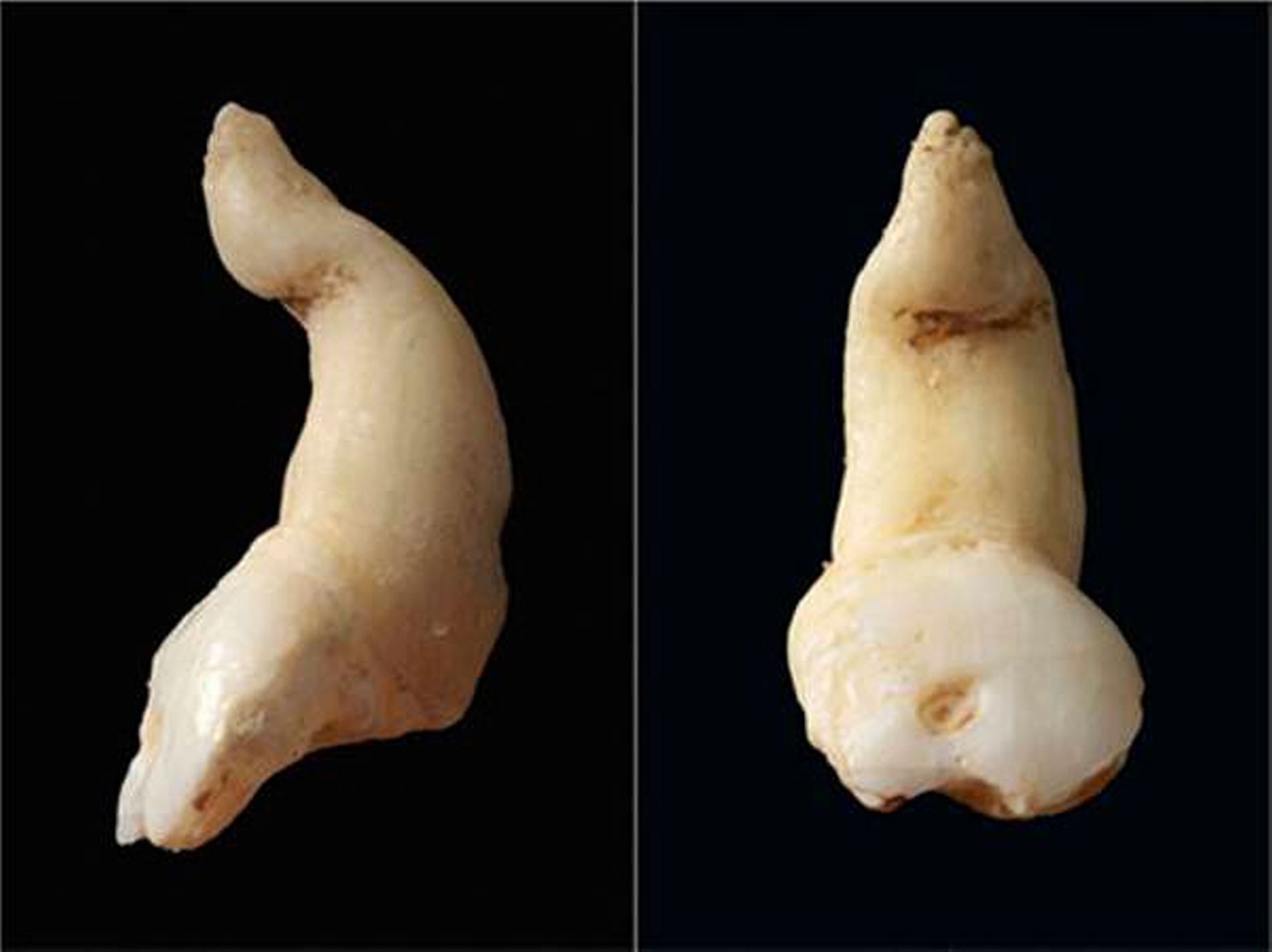Bei einem ausgeprägten Foramen caecum sollte eine weitere anatomisch-morphologische Variation in die Differenzialdiagnostik – zur Abklärung eventueller anatomischer Besonderheiten – einbezogen werden: In Verlängerung des Tuberculum dentis kann sich eine Fissur über die Schmelz-Zement-Grenze hinaus auf der Wurzeloberfläche fortsetzen. Je nach Ausprägung können diese Wurzelfurchen auch den Beginn von Wurzelseparationen darstellen. Im Ergebnis der Einfaltung des Schmelzepithels und der Einschnürung im Bereich der Hertwigschen Wurzelscheide enwickelt sich in seltenen Fällen eine rudimentäre oder vollständig ausgebildete Wurzel [Black, 1908; Arnold, 2007; Gandhi et al., 2011]. In seltenen Fällen können einwurzelige Zähne mit zwei oder mehr Wurzelkanälen [Kottoor et al., 2012] oder zweiwurzelige Zähne mit zwei Wurzelkanälen auftreten [Fabra-Campos, 1990] (Abbildung 17).
