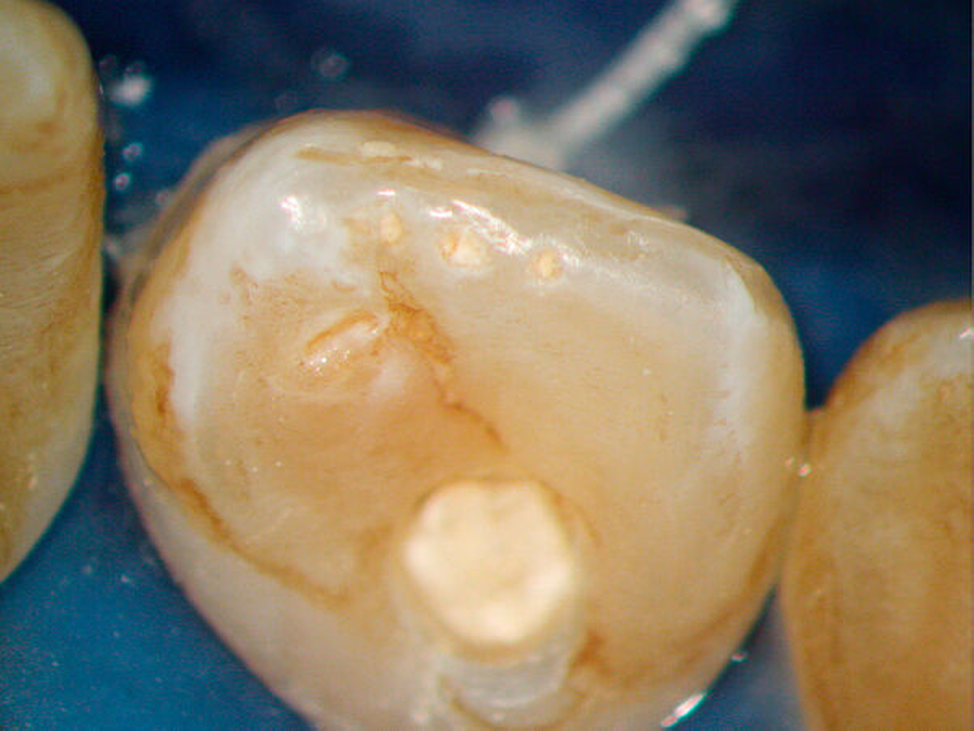 Kariesfolgeerkrankungen und traumatische Verletzungen sind die häufigsten Ursachen für eine endodontische Therapie. Insbesondere traumatische Verletzungen im Kopfbereich führen oft zu Verletzungen der Frontzähne mit pathologischen Veränderungen der Pulpa. Konkussions- und Dislokationsverletzungen können bei Erhalt der Pulpa und fehlender mikrobieller Infektion zu einer raschen Produktion von irregulärem Tertiärdentin (Osteoid) führen [Six et al., 2001; Mjör, 2002; Ørstavik & Pitt-Ford, 2008]. Degenerative und reparative Reaktionen der Pulpazellen können auch als Folge von Karies zur Bildung von Tertiärdentin, Dentikeln und verstärkter Mineralisation oder Fibrosierung der Pulpa beitragen. Dies kann sowohl das Auffinden des Wurzelkanaleingangs als auch das Erschließen und Erweitern des Wurzelkanals erheblich erschweren (Abbildung 1).