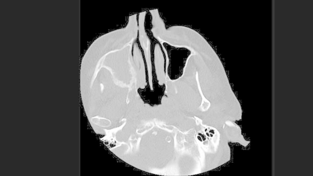 Auf dem Bild zeigte sich keine Fraktur, jedoch eine verbreiterte und unruhige Struktur der Maxilla rechtsseitig, die sich über die gesamte Wand der rechten Kieferhöhle, mit Ausnahme des Kieferhöhlendachs/Orbitabodens sowie den angrenzenden Processus pterygoideus des Os sphenoidale (Keilbein) erstreckte. Zudem war die rechte Kieferhöhle komplett verschattet (Abbildungen 1 und 2).