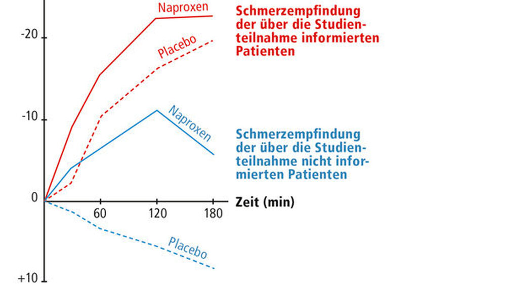 Der Erfolg kieferorthopädischer Behandlungen hängt immer in gewissem Maße von der Kooperation der Patienten ab, weshalb Verzerrungseffekte wie die „aktive Forschungsbeteiligung“ hier sehr stark zum Tragen kommen. Schon die Tatsache, dass von jedem RCT-Teilnehmer eine Einwilligungserklärung nach erfolgter Aufklärung obligatorisch ist (also die Forderung nach informed consent oder informierter Einwilligung), kann das Ansprechen auf die Therapie in einem klinisch möglicherweise höchst relevanten Maß beeinflussen. Bergmann et al. [Bergmann et al., 1994] starteten 1994, kurz vor Inkrafttreten dieser Aufklärungspflicht in Frankreich, eine RCT zum Einfluss der informierten Einwilligung auf die Wirkung von Analgetika. 49 konsekutiv hospitalisierte Patienten mit leichten bis mittelstarken Tumorschmerzen wurden nach dem Zufallsprinzip über ihre Teilnahme an der RCT entweder informiert oder nicht informiert. Im zweiten Schritt erfolgte, wieder per Los, die Zuteilung aller Patienten zu den Behandlungsgruppen Analgetikum (Naproxen) oder Placebo. Die Resultate (Abbildung 1) zur Schmerzlinderung erbrachten in der nicht informierten Normalfallgruppe erwartungsgemäß eine Wirkung des Analgetikums, nicht aber des Placebo. Mit dem Umstand der Aufklärung veränderte sich dieses Bild massiv: Das Placebo wie auch das Analgetikum reduzierten die Tumorschmerzen unter den informierten Patienten signifikant stärker und nachhaltiger als unter den normalen klinischen Bedingungen.