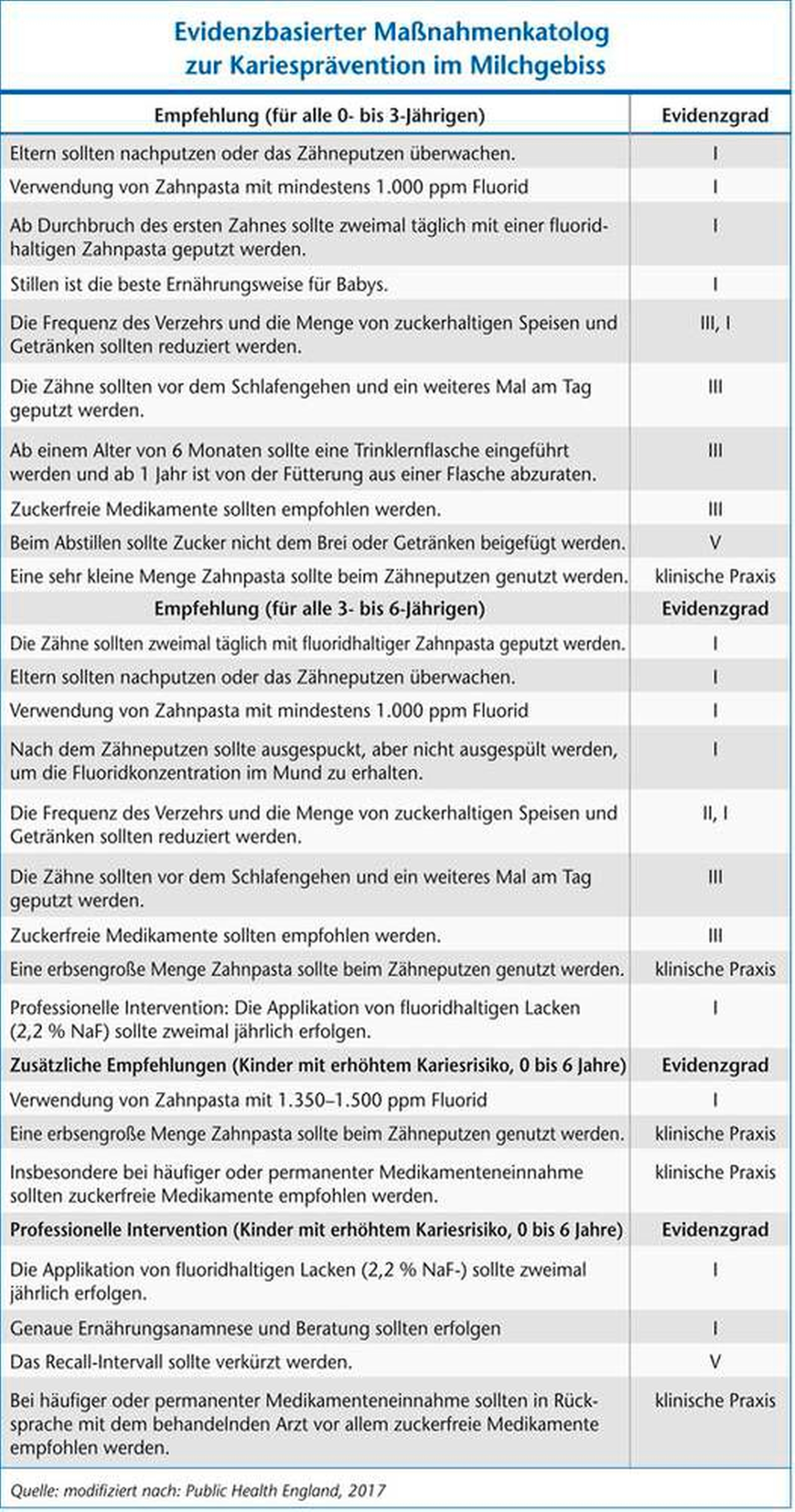 Weiterhin geben die englischen, auf einem systematischen Review beruhenden und damit evidenzbasierten Empfehlungen eine gute Übersicht, welche Maßnahmen für das Milchgebiss im Allgemeinen und bei erhöhtem Kariesrisiko sowohl in der Praxis als auch häuslich eingesetzt werden sollten (Tabelle 1) [Public Health England, 2017]. Entsprechend den Ausführungen oben enthalten diese Maßnahmen häufig das Wort Fluorid in allen Applikationsformen, worauf der primäre Fokus in der Kariesprävention liegen sollte. Andere Maßnahmen sind eher additiv. Dies wäre für eine zeitgemäße und wirksame Gruppenprophylaxe essenziell, wie erfolgreiche Pilotprogramme in Greifswald oder Osnabrück-Land belegen [Schüler, 2015; Brunner-Strepp, 2001].