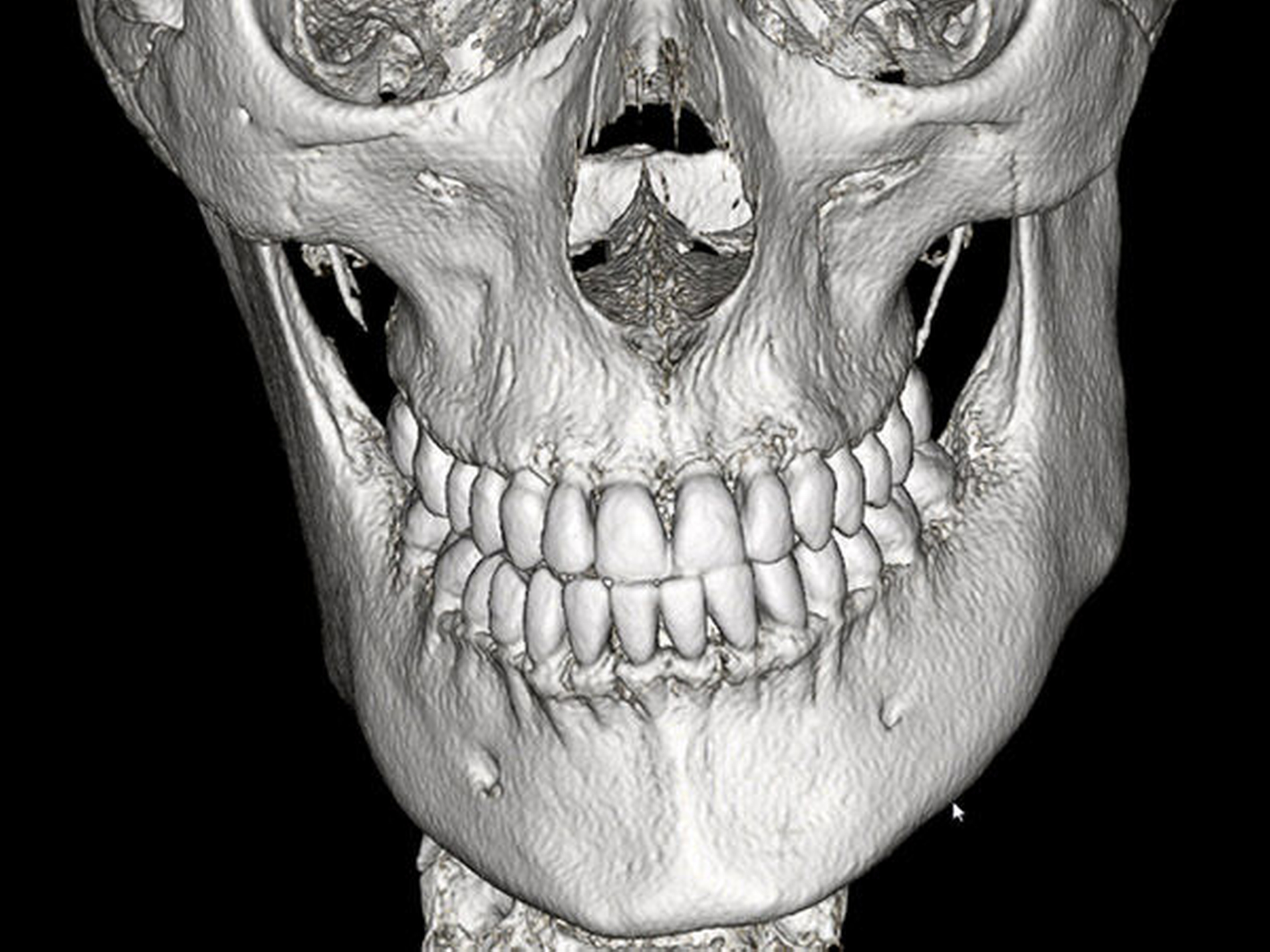 Mit Verdacht auf eine kondyläre Hyperplasie des rechten Unterkiefers wurde die Durchführung einer Skelettszintigrafie (Abbildung 3A) sowie einer CT-Bildgebung (Abbildung 3B) des Kiefers angeordnet. Hierbei konnte eine fokale Knochenstoffwechselanreicherung im Bereich des rechten Kiefergelenkköpfchens nachgewiesen werden. Die Kortikalis des rechten Kondylus war im Vergleich zur Gegenseite deutlich stärker ausgebildet, Hinweise auf eine tumoröse Raumforderung fanden sich in der CT nicht.