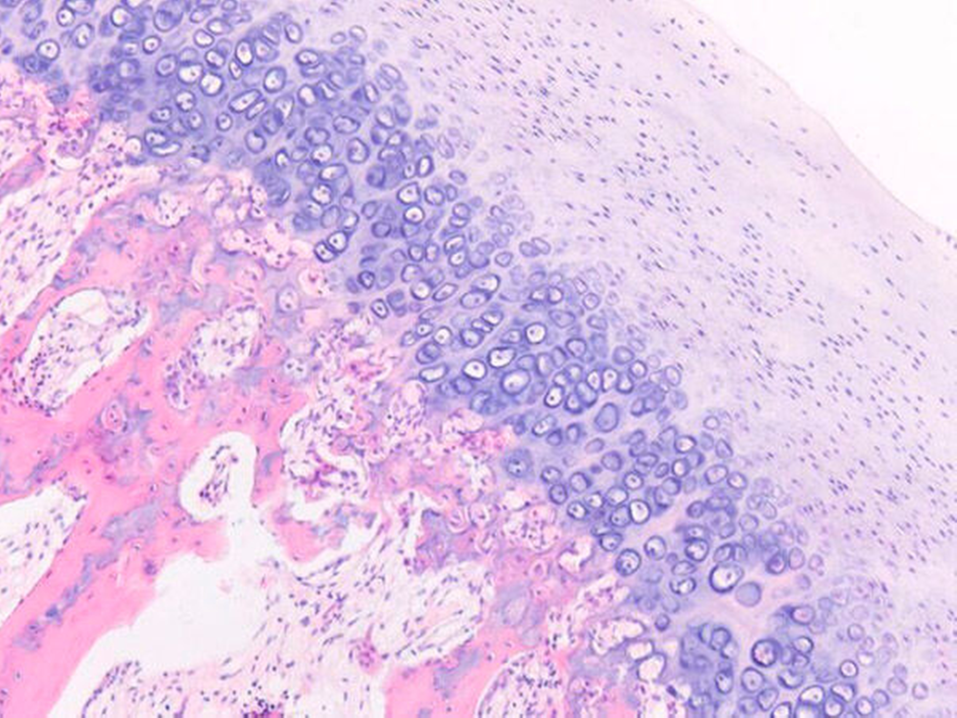 Die Patientin wurde in der Folge stationär aufgenommen und es erfolgte aufgrund der aktiven kondylären Hyperplasie eine hohe Kondylektomie rechts über einen präauriculären Zugang in Allgemeinanästhesie (Abbildung 4). Postoperative Komplikationen ergaben sich keine. Die Patientin war subjektiv beschwerdefrei, der Neurostatus unauffällig und die Nonokklusion im rechten Eck-/ Seitenzahnbereich deutlich gemindert. Eine Elongationsschutzschiene wurde in Absprache mit dem Kieferorthopäden angefertigt und eingegliedert. Im Rahmen der pathohistologischen Begutachtung des Resektats konnte der Verdacht einer kondylären Hyperplasie bestätigt werden (Abbildung 5).