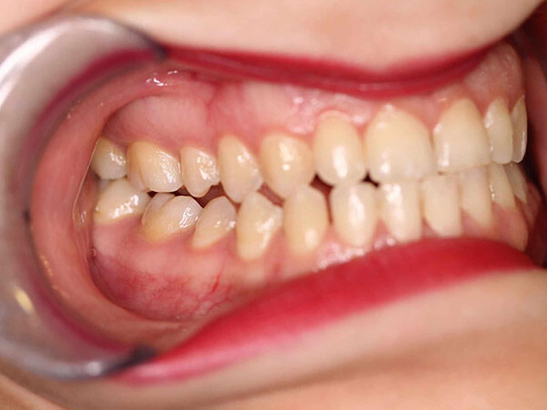 Intraoral fand sich eine Mesialbisslage von einer halben Prämolarenbreite im Seitenzahnbereich beidseits. Ein Kontakt bestand regio 16/47 mit Nonokklusion der restlichen ipsilateralen Eck- und Seitenzahnregion (Abbildung 2). In regio 11/41 fand sich eine Kreuzbisssituation, in regio 21/31 eine Kopfbisssituation. Die Unterkiefermittellinie war interessanterweise um 3 bis 4 mm nach rechts verschoben, das knöcherne Kinn hingegen nach links. Weitere faziale Fehlbildungen lagen nicht vor.