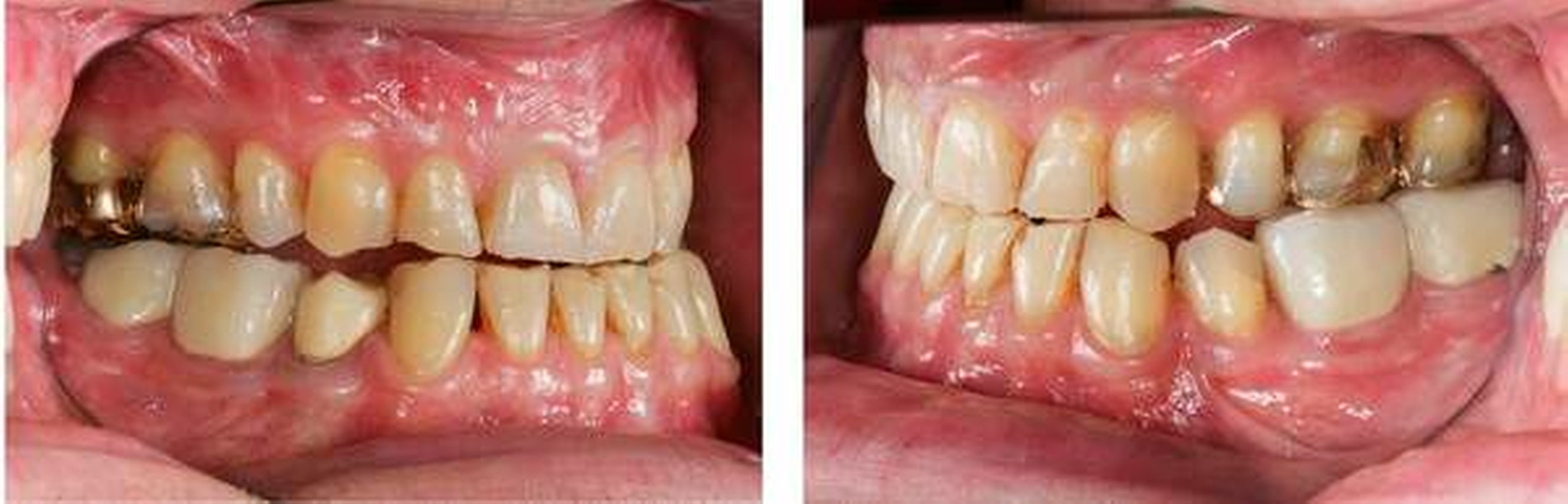 Nach kieferorthopädischer/kieferchirurgischer Behandlung sowie prothetischer Versorgung der Unterkieferseitenzähne mit Vollkronen stellte sich der 57-jährige Patient in unserer Praxis mit dem Wunsch nach einer umfassenden prothetischen Rehabilitation vor. Sein Hauptproblem sind die mangelnde Kauleistung sowie erschwertes „Schneiden“ mit den Frontzähnen. Die Schneidekanten und Eckzahnspitzen der Ober- und Unter-kiefer-Frontzähne sind aufgrund hoher parafunktioneller Aktivität stark attritiert. Die vier ersten Prämolaren wurden aus kiefer-orthopädischen Gründen entfernt. Ober- und Unterkieferfrontzähne sind retrudiert und stehen im Kopfbiss. Die Schneidezahn- und Eckzahnführung ist nicht gegeben. Sowohl in Protrusion als auch bei Laterotrusion nach rechts und links führen „gelenknah“ die Molaren, so dass der Frontzahnkontakt in dynamischer Okklusion aufgehoben wird (Abbildungen 5a und b).