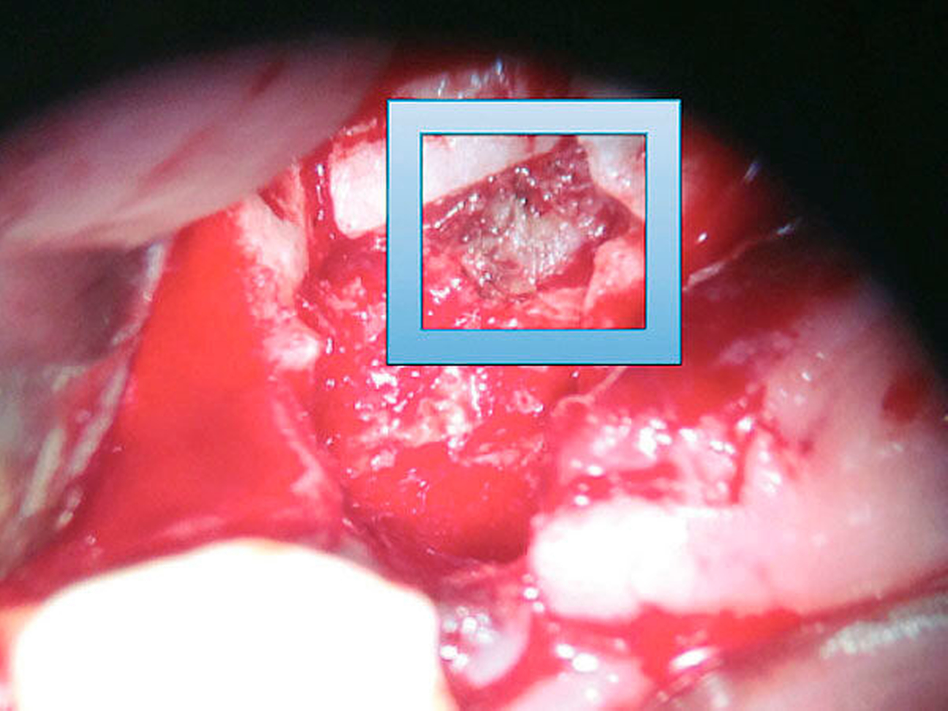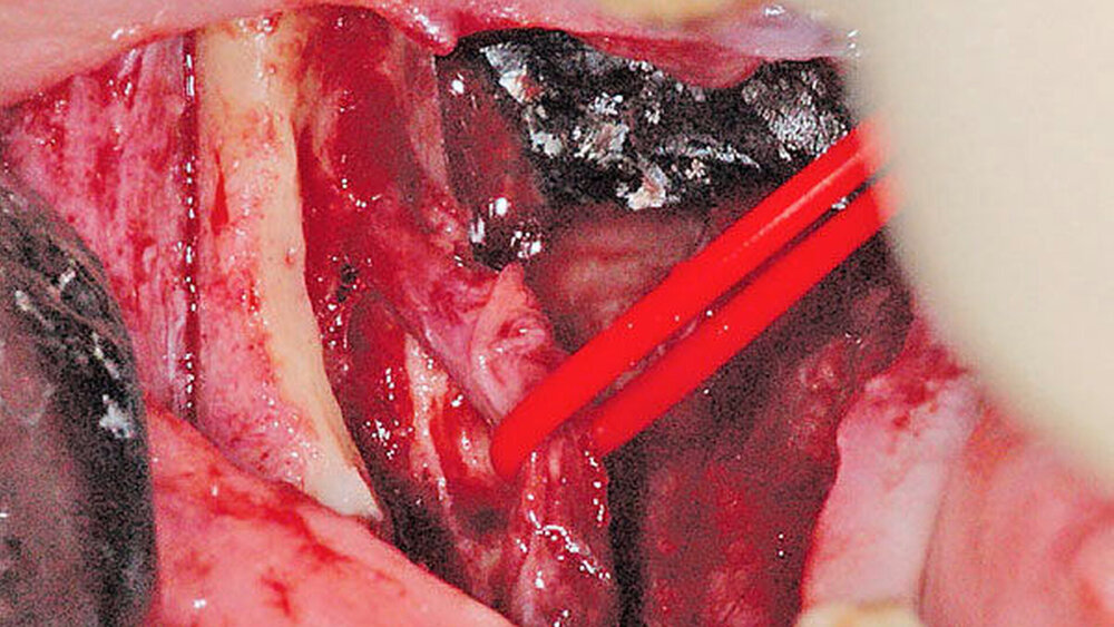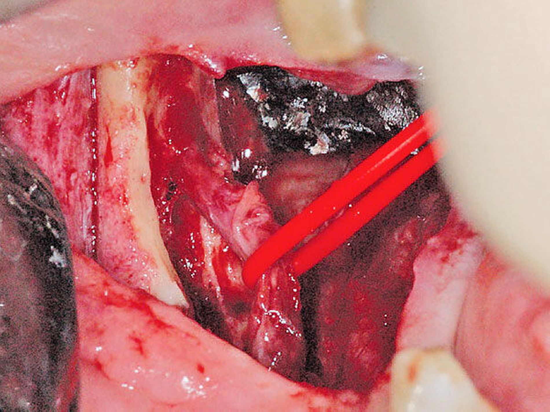 Leider gibt es keine Möglichkeit, Nerven nach außen wirksam darzustellen; daher ist eine explorative Operation erforderlich, und die Behandlungsentscheidung muss getroffen werden, während sich der Patient auf dem Operationstisch befindet [Kushnerev E, Yates JM, 2015]. Es gibt eine Reihe von Methoden, um Nervschäden zu reparieren. So kann je nach Bedarf gewählt werden zwischen externer Dekompression des N. alveolaris inferior (Abbildung 3) [Bagheri SC et al., 2012] , direkten Nervnähten [Cornelius CP et al., 1997] und der Rekonstruktion mit autologen Transplantaten (Nerven (N. suralis / N. aurikularis magnus) oder Venen) [Cornelius CP et al., 1997; Pogrel MA, Maghen A, 2001]. Weitere Möglichkeiten bestehen in der Anwendung von allogenen Manschetten um den beschädigten Nerv sowie in der großflächigen Freilegung, Mobilisation (Abbildung 4) und Readaptation der Nerven.